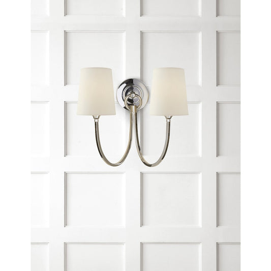 Reed Wandleuchte, doppelt, poliertes Nickel mit Leinenschirmen