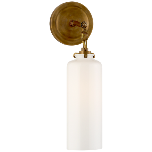 Hohe, schwenkbare Wandleuchte „Keeley“ aus handpoliertem antikem Messing mit weißem Glas