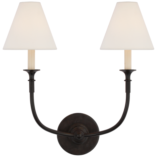 Doppelte Wandleuchte Vendome aus Bronze mit Leinenschirmen