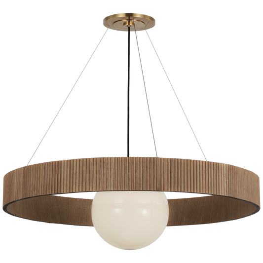 Arena 42" Ring und Globus Kronleuchter aus handpoliertem antikem Messing und natürlicher Eiche mit weißem Glas