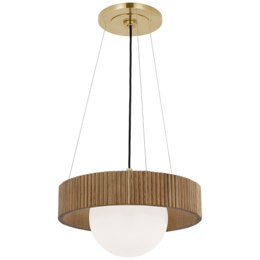 Arena 18" Ring und Globus Kronleuchter aus handpoliertem antikem Messing und natürlicher Eiche mit weißem Glas