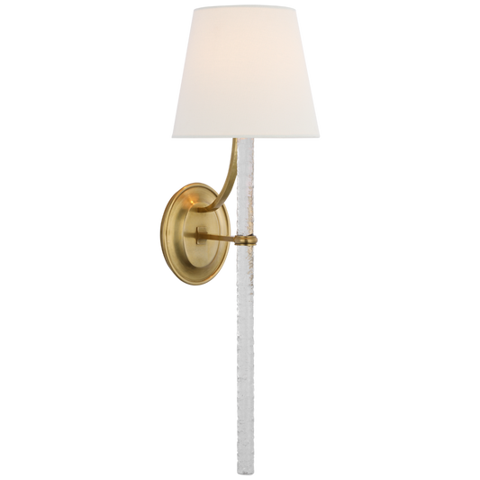 Abigail Wandleuchte, groß, weiches Messing und klares gewelltes Glas mit Leinenschirm