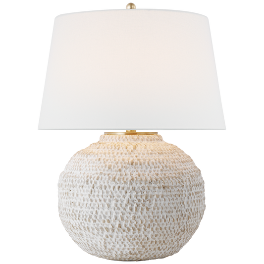 Avedon kleine Tischlampe aus Gips, weißes Rattan mit Leinenschirm