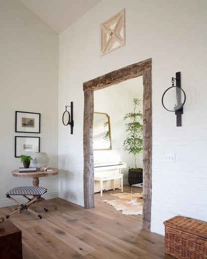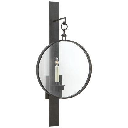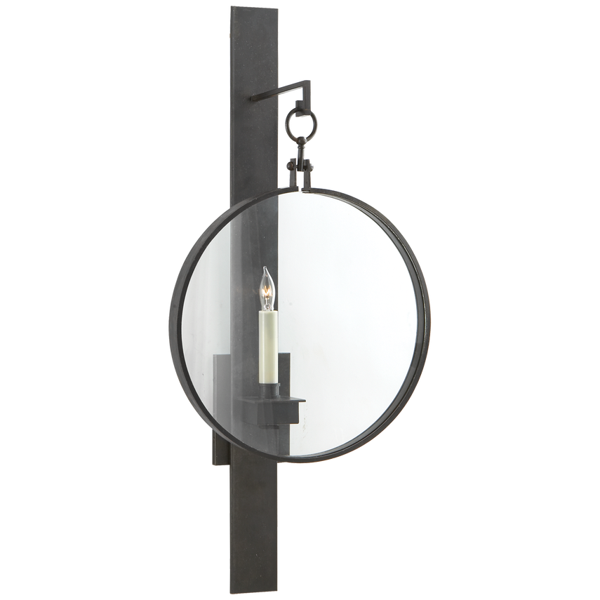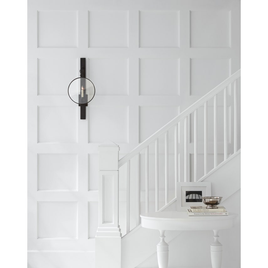 Suzanne Kaslers vielseitige Alice besticht durch ihre eindrucksvolle Vintage-Silhouette und passt in viele Räume. Die Wandleuchte ist in zwei Größen erhältlich und zeichnet sich durch eine längliche, rechteckige Rückseite aus gealtertem Eisen aus, von der ein Kerzenarm mit Glühbirne ausgeht, eingerahmt von einer großen Glasplatte, die an einem schlanken Arm hängt.