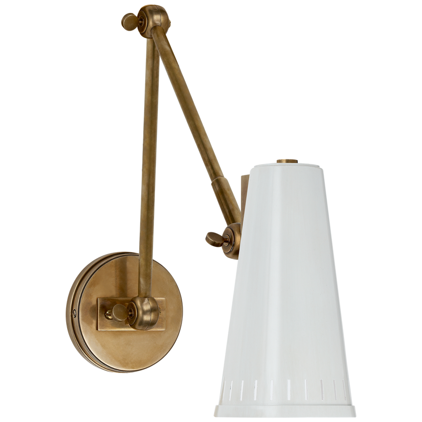 Antonio verstellbare Lampe mit zwei Armen, handpoliertes Antikmessing mit antikweißem Schirm