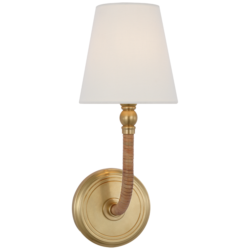 Basden Wandleuchte, mittelgroß, aus antikem Messing und natürlichem Rattan mit Leinenschirm