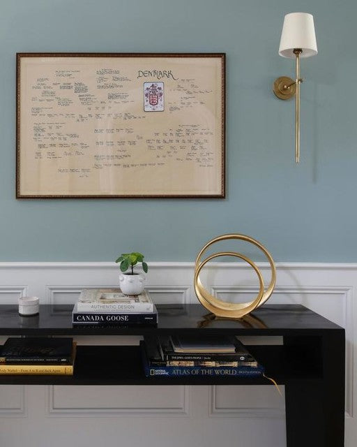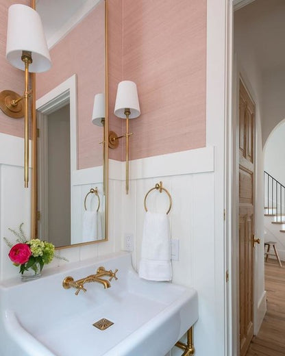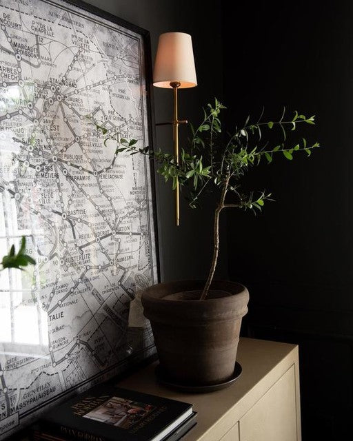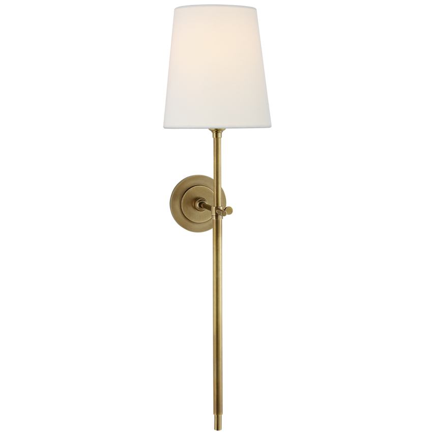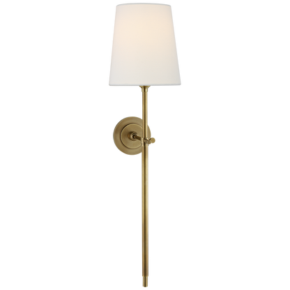 Bryant Large Tail Wandleuchte aus handpoliertem antikem Messing mit Leinenschirm