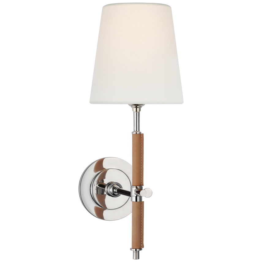 Bryant Wandleuchte aus poliertem Nickel und Naturleder mit Leinenschirm