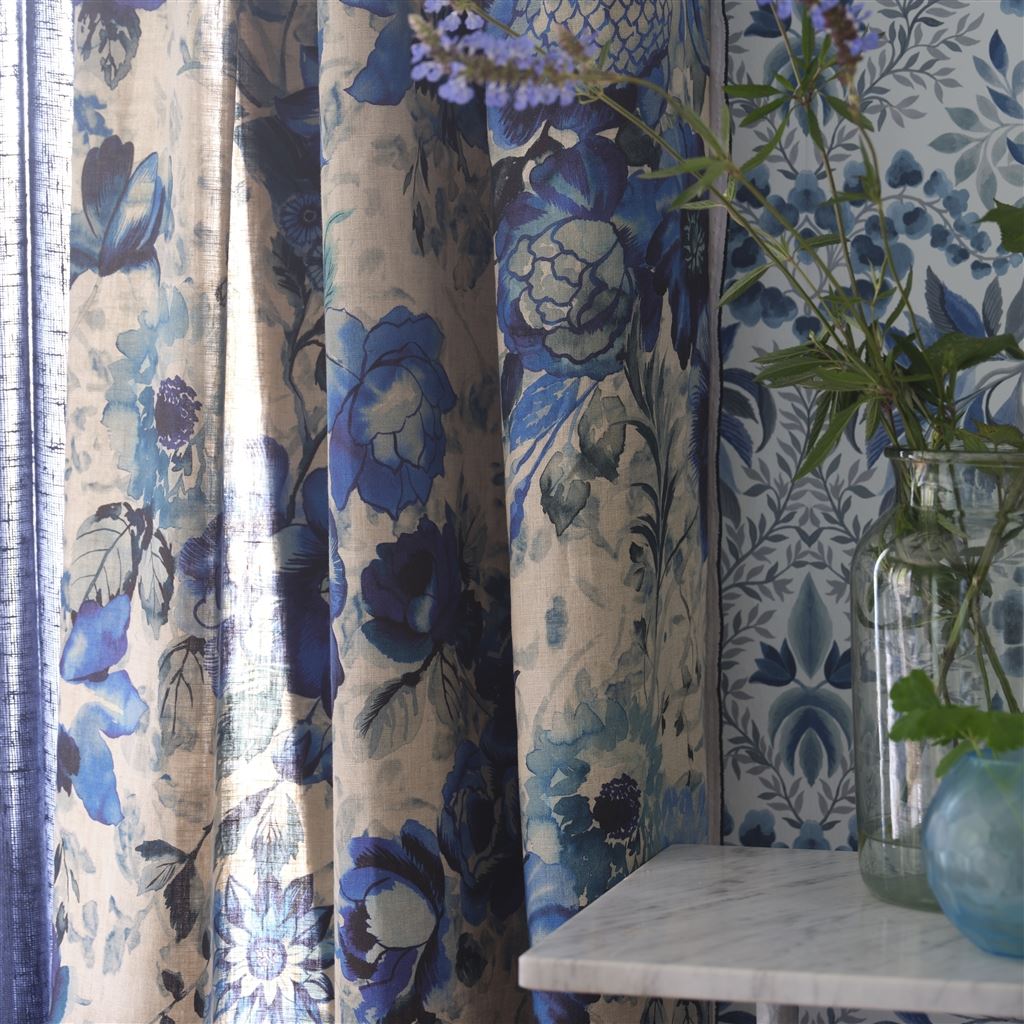 Die Hirigana-Malerei zelebriert die Natur mit spektakulären, verwaschenen Pinselstrichen. Diese atemberaubende Blumenstudie in satten Kobaltblau- und Indigotönen wird digital auf einen natürlichen Leinenhintergrund gedruckt, der dann leicht gerollt wird, um einen atemberaubenden Fall für einen eleganten Vorhang zu erzielen. Erhältlich in einer spektakulären Farbe. OEKO-TEX® Standard 100 zertifiziert, um sicherzustellen, dass keine schädlichen Chemikalien enthalten sind. (Stoff – Breite: 135 cm, horizontale Passform: 135 cm, vertikale Passform: 101 cm, 169,00 pro Meter)