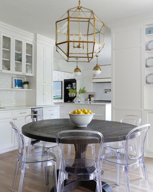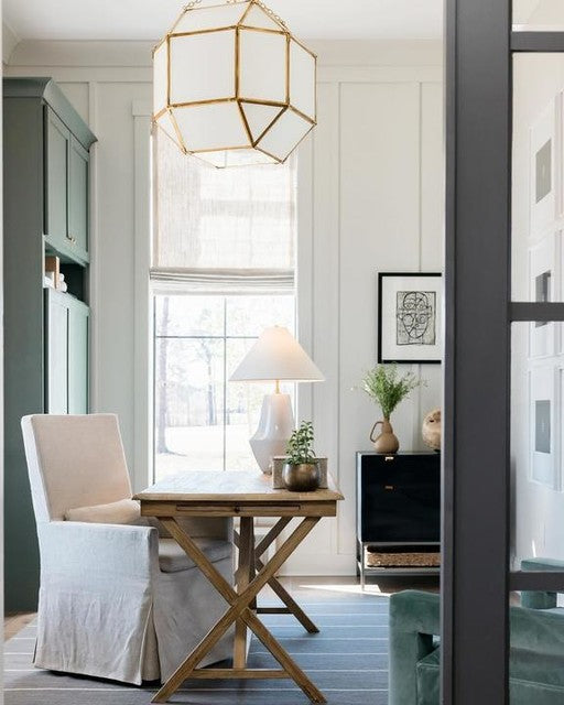 Die Morris-Leuchte von Suzanne Kasler verleiht jeder Küche oder jedem Eingangsbereich einen edlen Charme. Klare oder weiße Glasscheiben zieren den geometrischen Rahmen aus antikem Zink, poliertem Nickel oder vergoldetem Eisen und sorgen für helleres oder diffuseres Licht.
