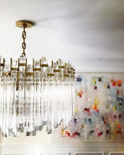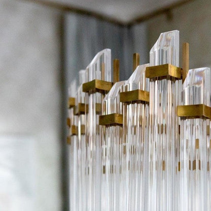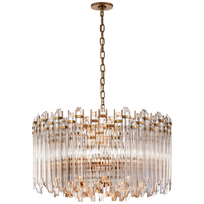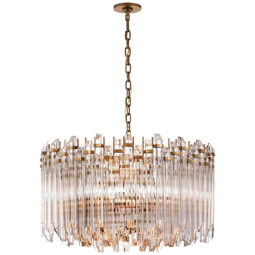 Kronleuchter Adele, groß, breit, Trommelform, handpoliertes Antikmessing mit klarem Acryl