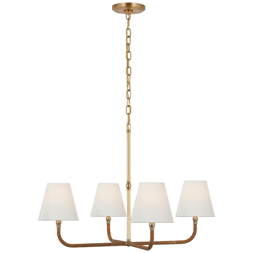 Basden, mittelgroßer einstöckiger Kronleuchter aus antikem Messing und natürlichem Rattan mit Leinenschirm