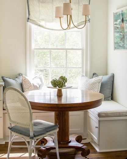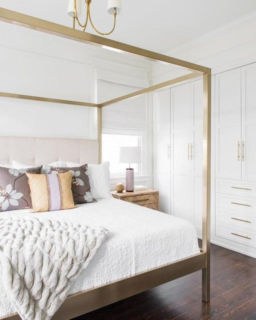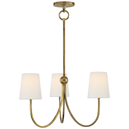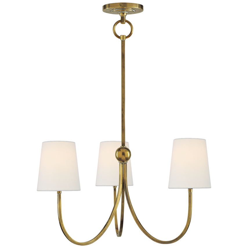 Kronleuchter Reed, klein, handpoliertes Antikmessing mit Leinenschirmen