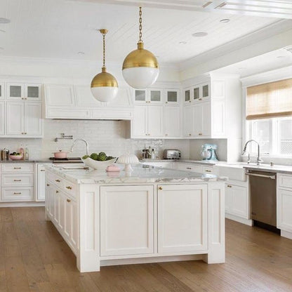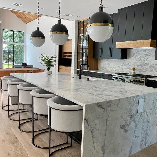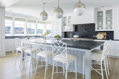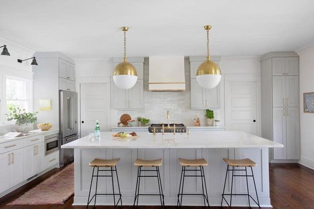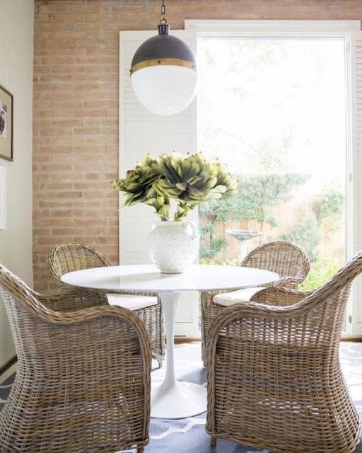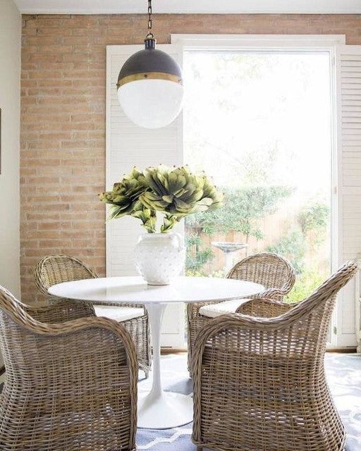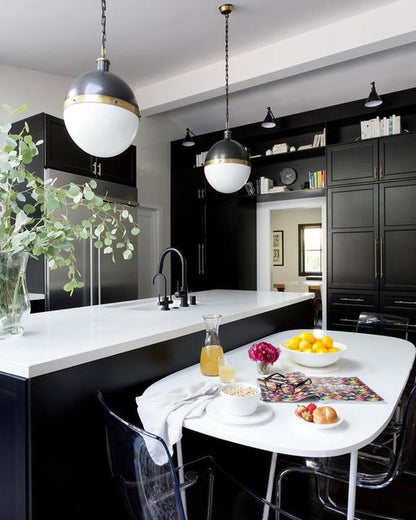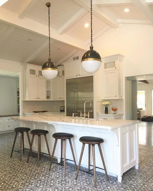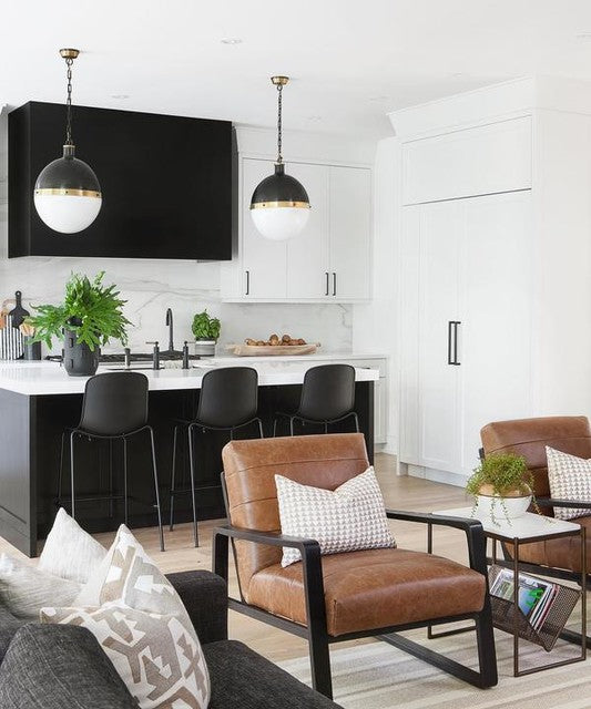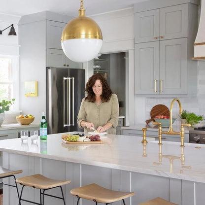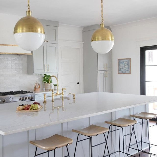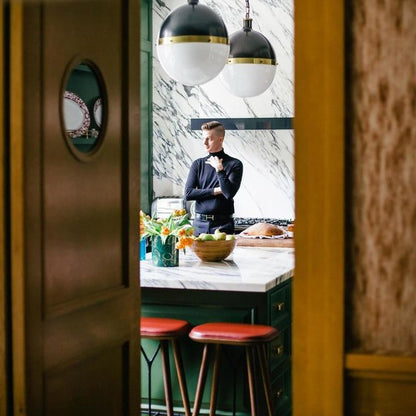 Die Hicks-Kollektion von Thomas O'Brien verbindet traditionelle Elemente mit modernen Details. Diese vielseitige Serie zeichnet sich durch genietete Metallbänder und weiße Glaskugeln aus. Ob Pendelleuchten, Deckenleuchten, Deckenventilatoren oder Bücherregalleuchten – die Silhouetten fügen sich mühelos in jeden Raum ein.