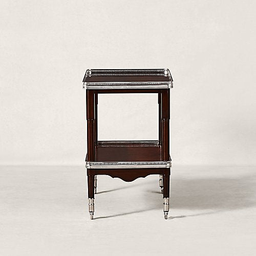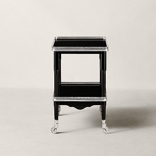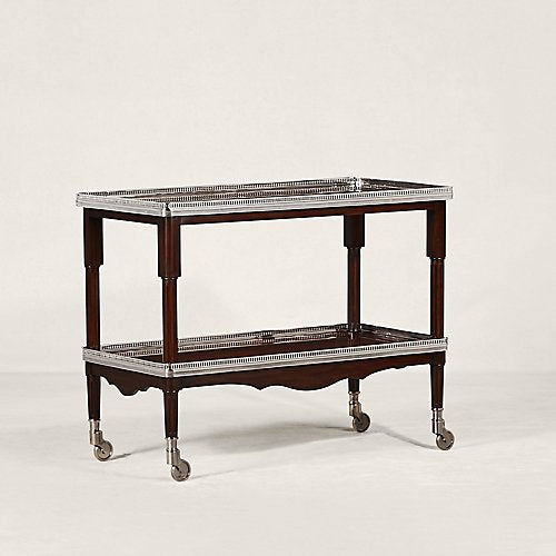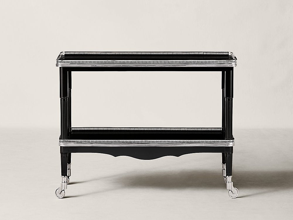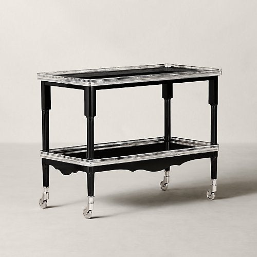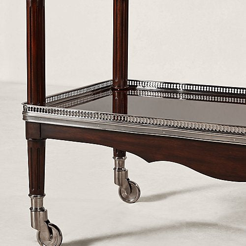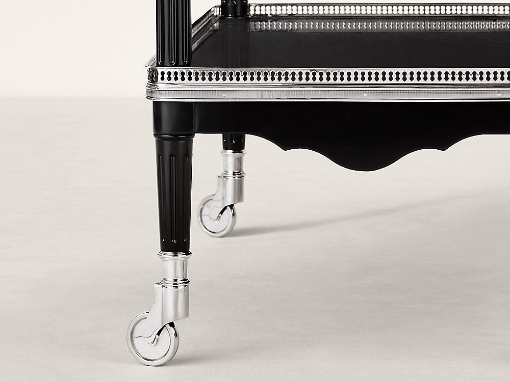 Jedes Detail des One Fifth-Barwagens von Ralph Lauren strahlt Art-déco-inspirierte Eleganz aus, von der perforierten Edelstahlverzierung bis zum atemberaubenden Gürtel. Die sorgfältig aus handbearbeitetem Mahagoni gefertigte zweistufige Silhouette steht auf polierten Rollen und ermöglicht so eine einfache Bewegung.