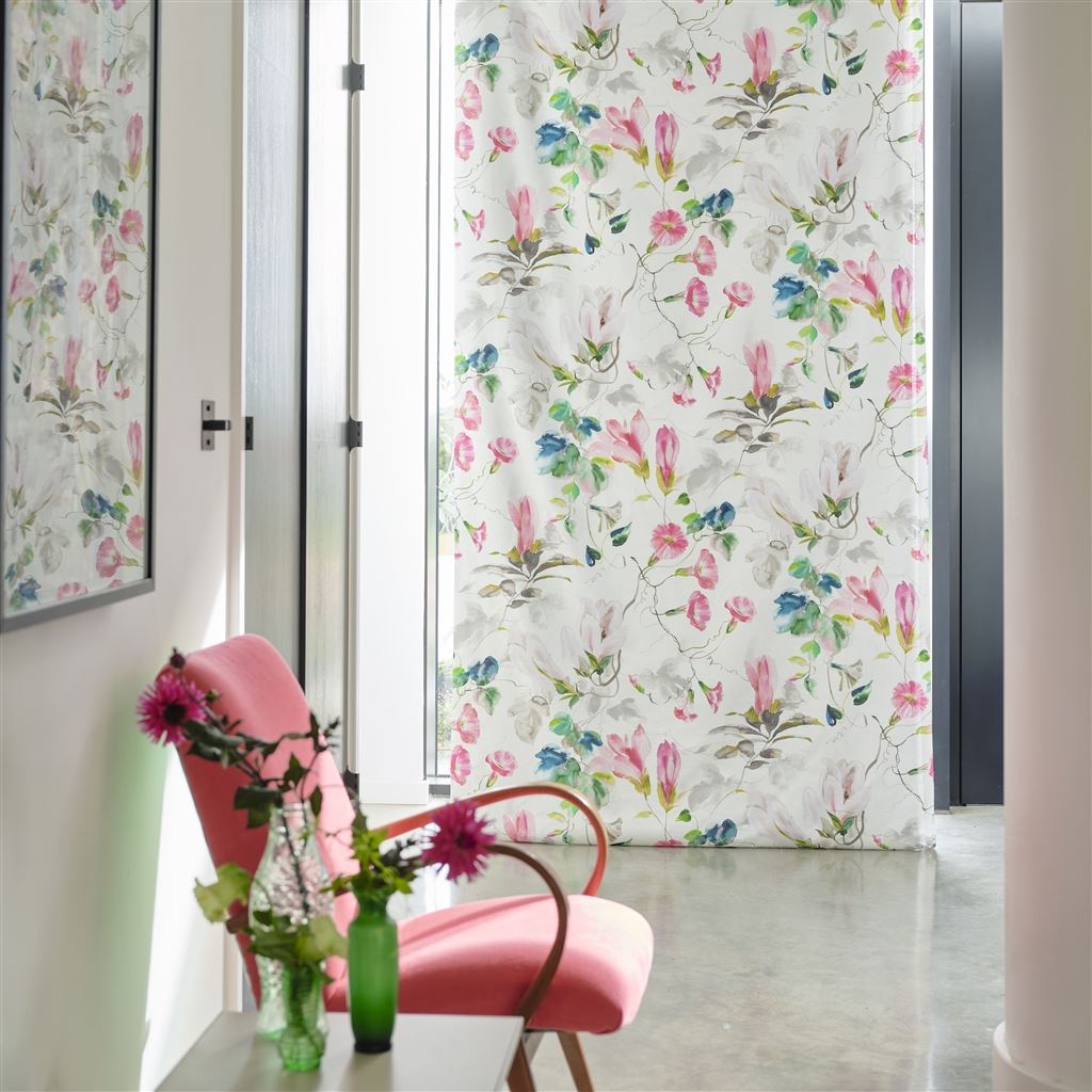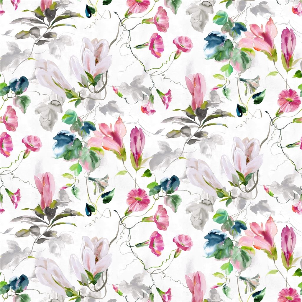 Die Magnolie wird in diesem atemberaubenden Druck für ihre majestätische künstlerische Form gefeiert. Die Blüten und Zweige der Magnolie sind in sanften Aquarelltönen auf einem reinweißen Hintergrund dargestellt. Digitaldruck auf dezent geflammter, waschbarer Baumwolle. Erhältlich in zwei wunderschönen Farben. (Stoff – Breite: 139 cm, horizontale Verbindung: 139 cm, vertikale Verbindung: 90 cm, 146,00 pro Meter)