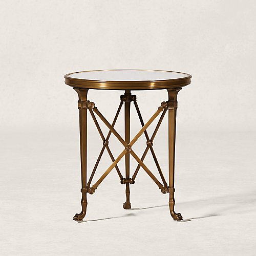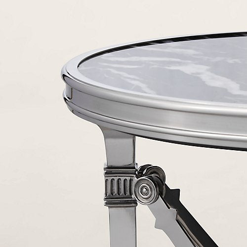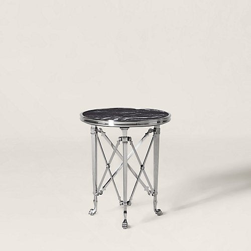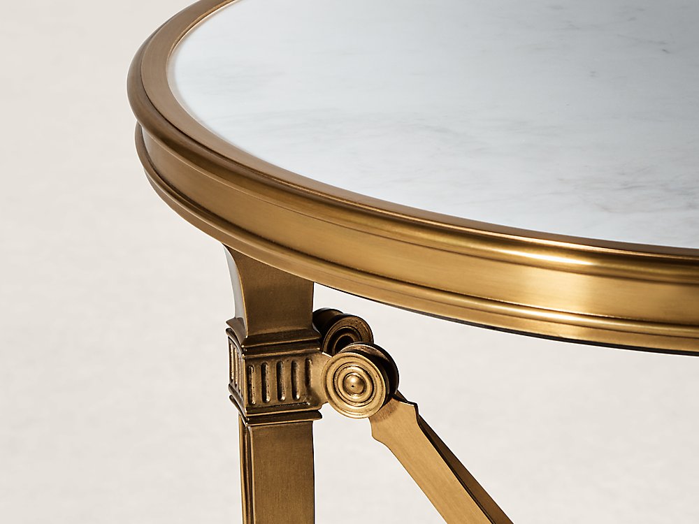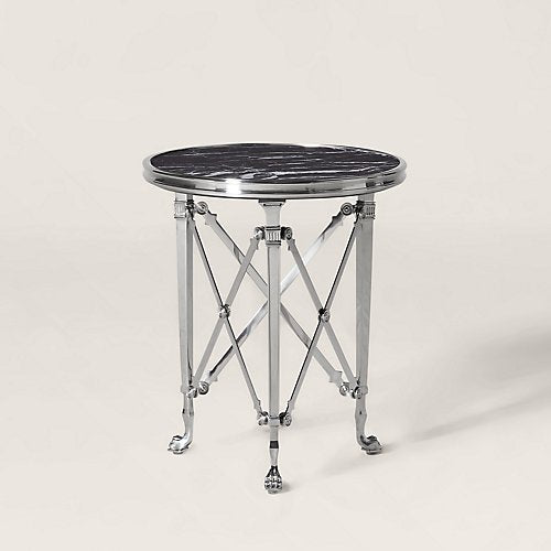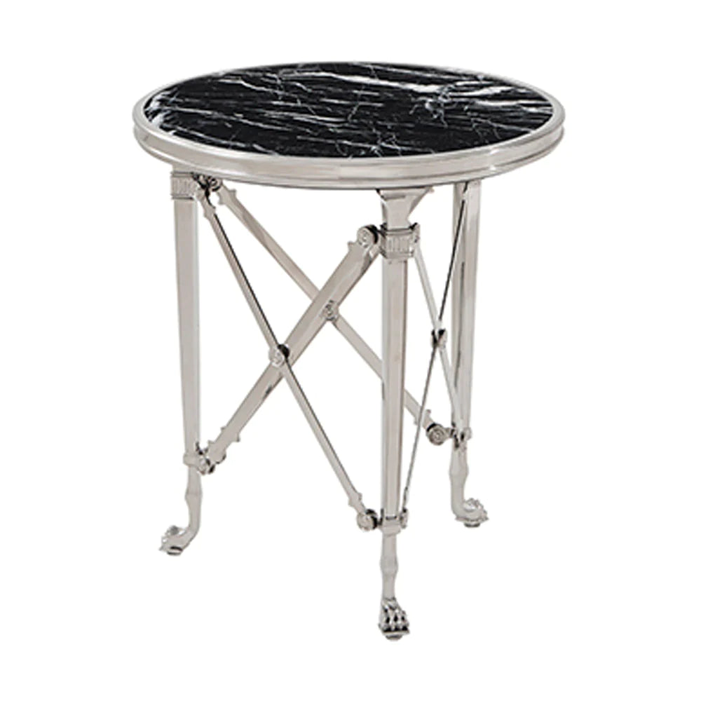 Der neoklassizistisch inspirierte Cannes-Säulentisch verfügt über einen skulpturalen Sockel mit zart gravierten Schriftrollen und wunderschön gefertigten und handgefertigten Löwentatzenbeinen. Es ist mit behandeltem Nero-Marquina-Marmor verkleidet, einer atemberaubenden Sorte aus Nordspanien, die sich durch ihr leuchtend weißes Adermuster auszeichnet.