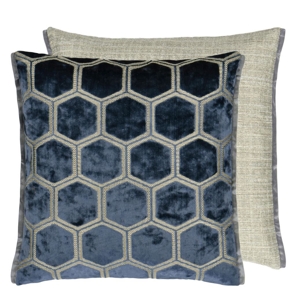 This elegant square cut velvet cushion in Manipur Midnight features a geometric hexagonal scale with a unique pattern effect on the background. Sleek and sophisticated, this luxurious cushion is finished with a cool Kumana marble backing and zinc trim.