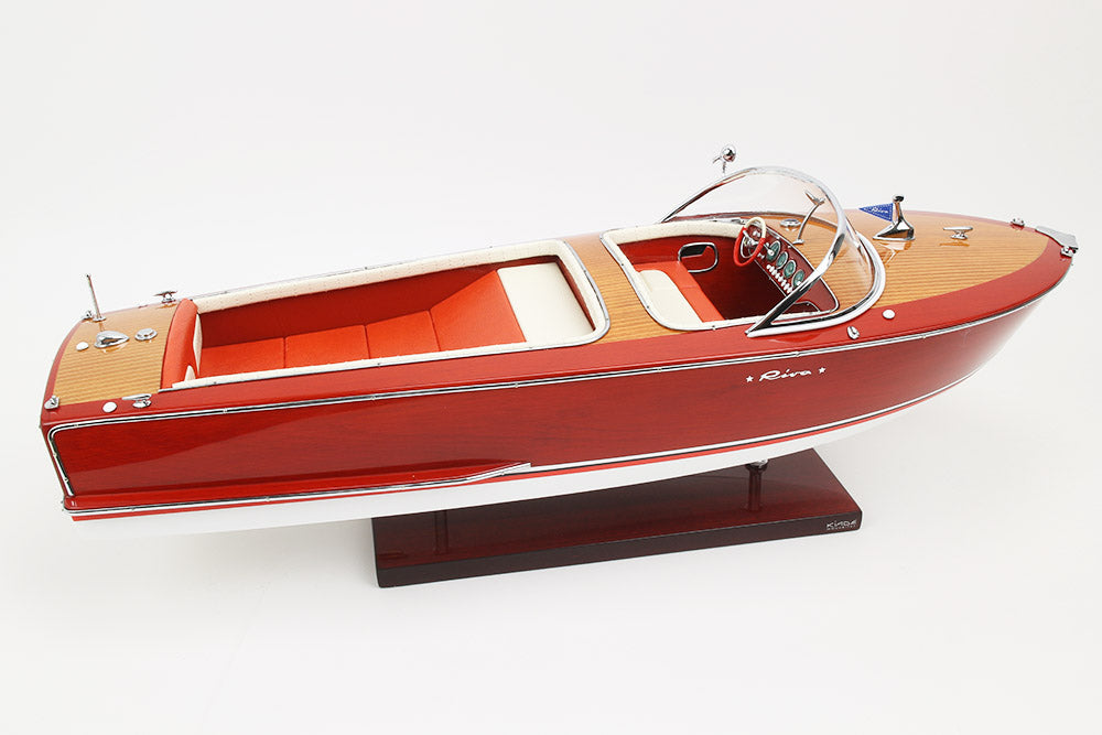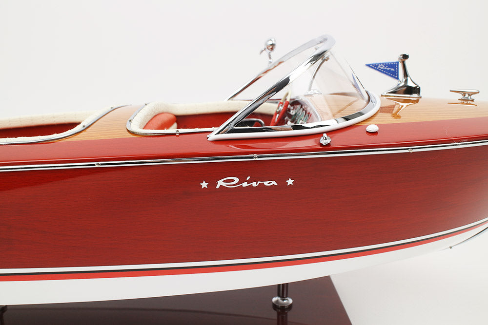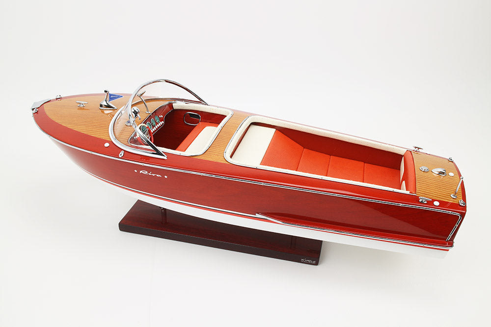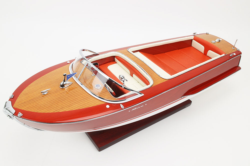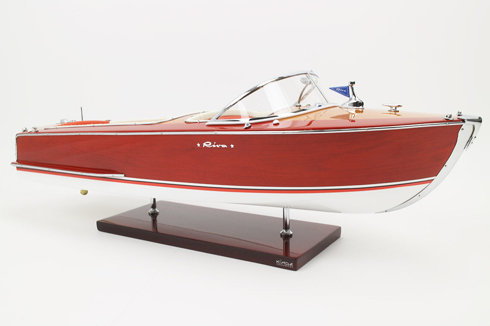 This model with a length of 70 cm was made at 1/20th scale. A faithful replica of the prestigious Rivarama, this exclusive official model is entirely handmade. The hull was made according to the original plans in fiberglass and polyester. All fittings are made to measure in chrome-plated brass by jewelers. Real marine upholstery is used to make the seats and the sun lounger. 10 coats of varnish are applied to the deck to achieve excellent shine and varnish depth. A metallic paint is applied to the hull.