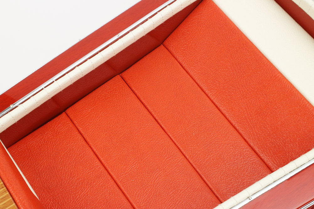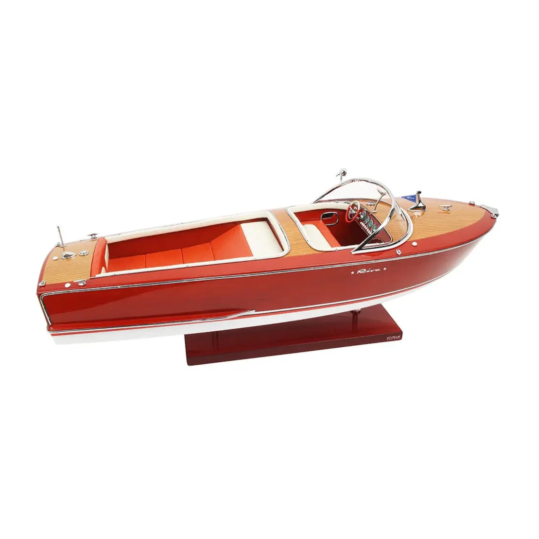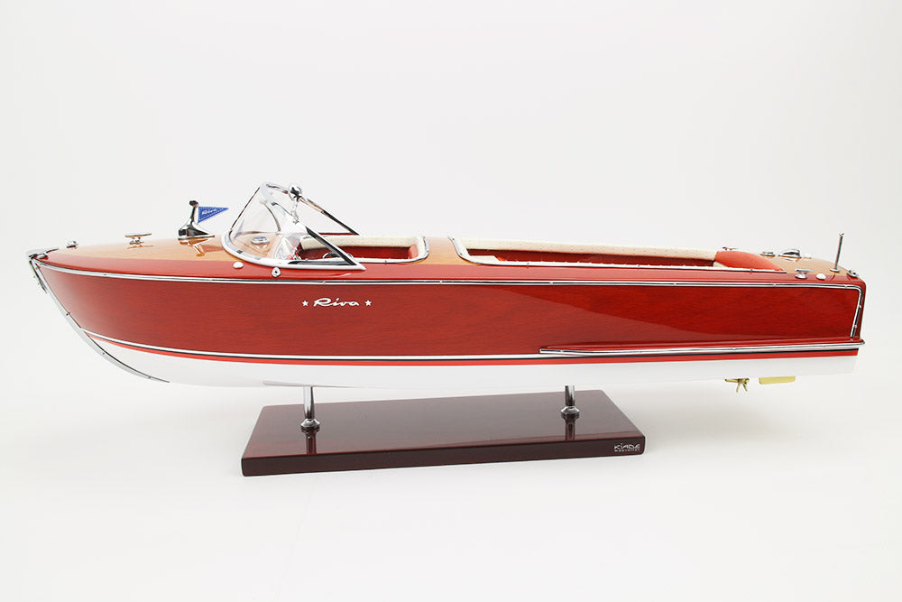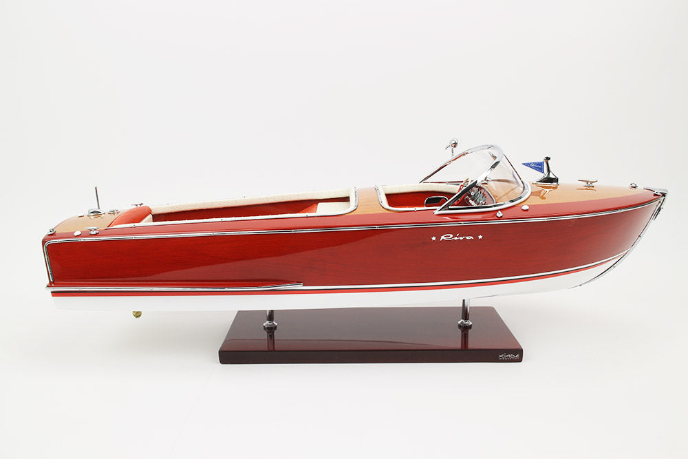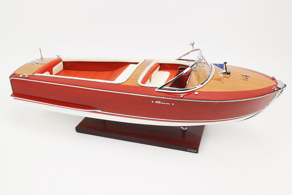 This model with a length of 70 cm was made at 1/20th scale. A faithful replica of the prestigious Rivarama, this exclusive official model is entirely handmade. The hull was made according to the original plans in fiberglass and polyester. All fittings are made to measure in chrome-plated brass by jewelers. Real marine upholstery is used to make the seats and the sun lounger. 10 coats of varnish are applied to the deck to achieve excellent shine and varnish depth. A metallic paint is applied to the hull.