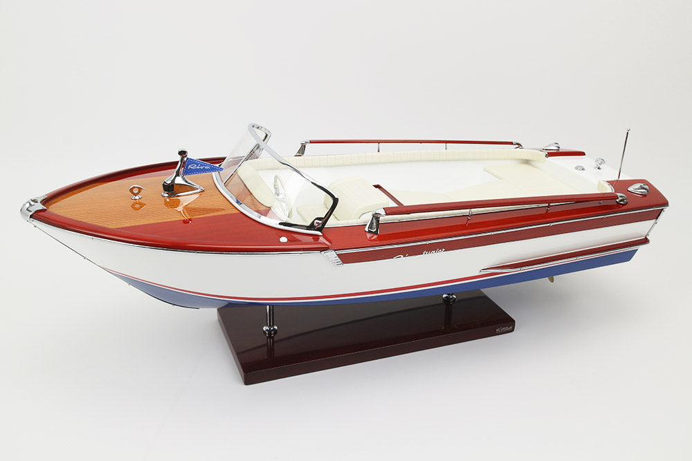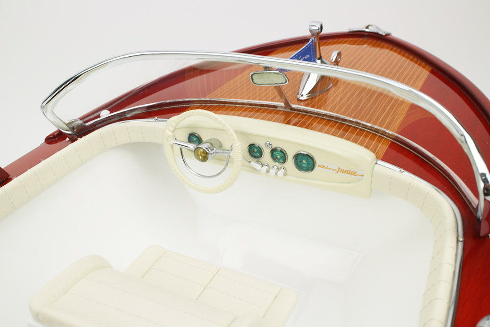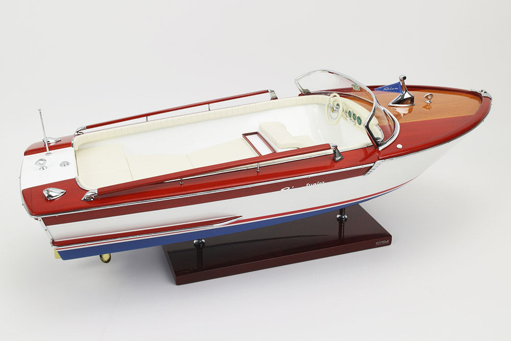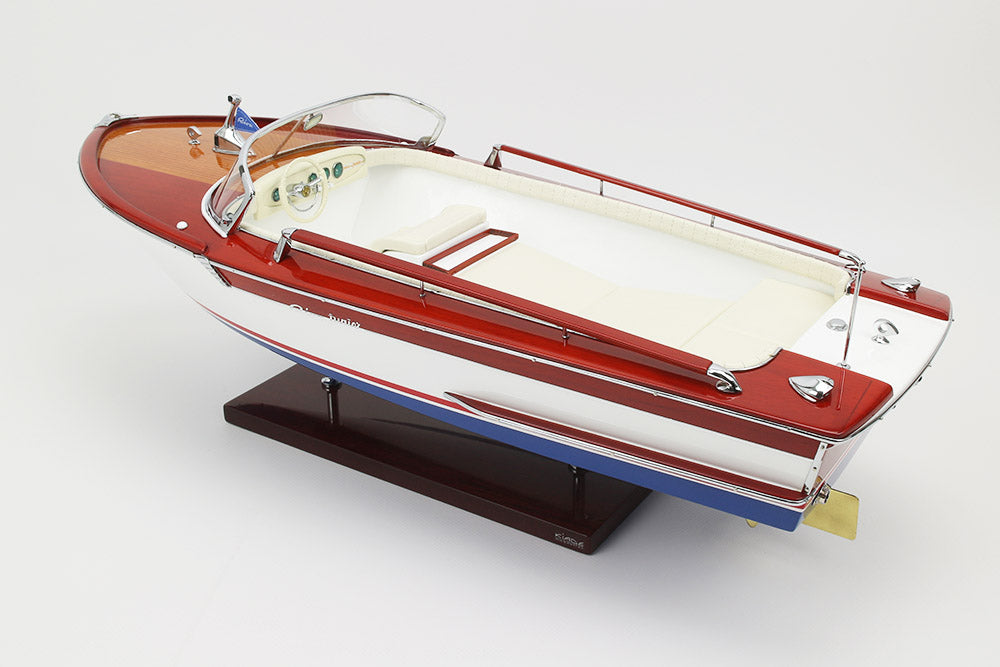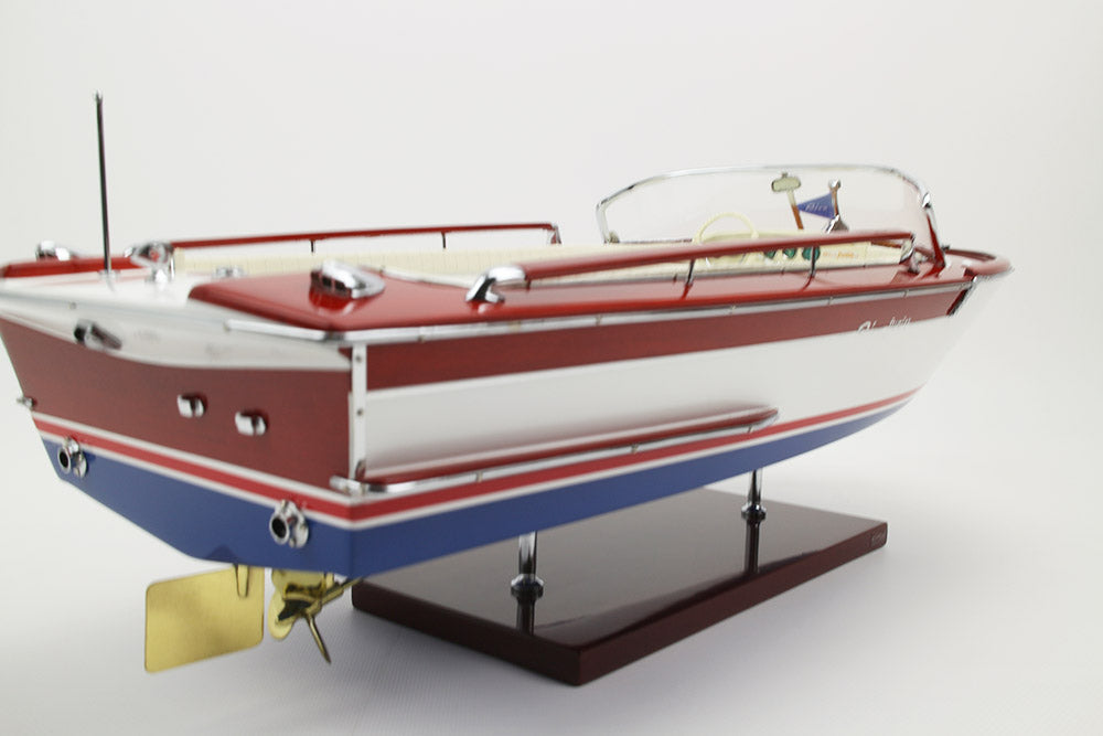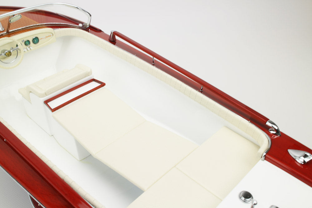 This model with a length of 70 cm was made at 1/20th scale. A faithful replica of the prestigious Rivarama, this exclusive official model is entirely handmade. The hull was made according to the original plans in fiberglass and polyester. All fittings are made to measure in chrome-plated brass by jewelers. Real marine upholstery is used to make the seats and the sun lounger. 10 coats of varnish are applied to the deck to achieve excellent shine and varnish depth. A metallic paint is applied to the hull.