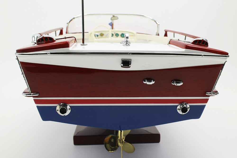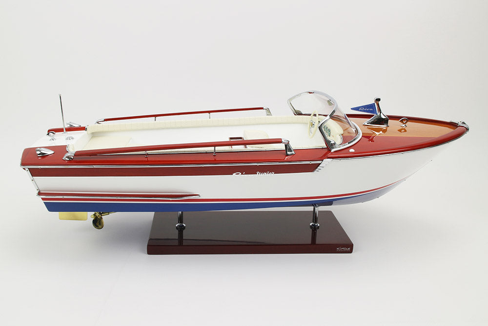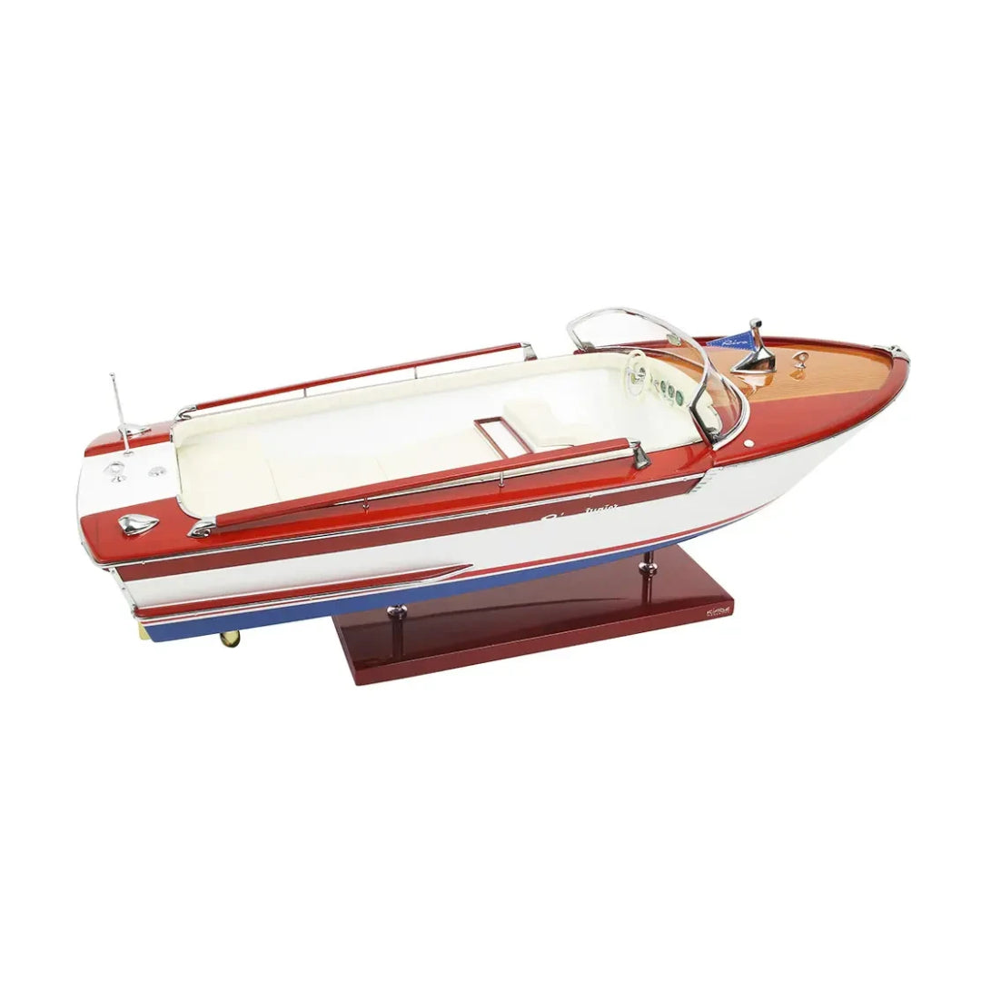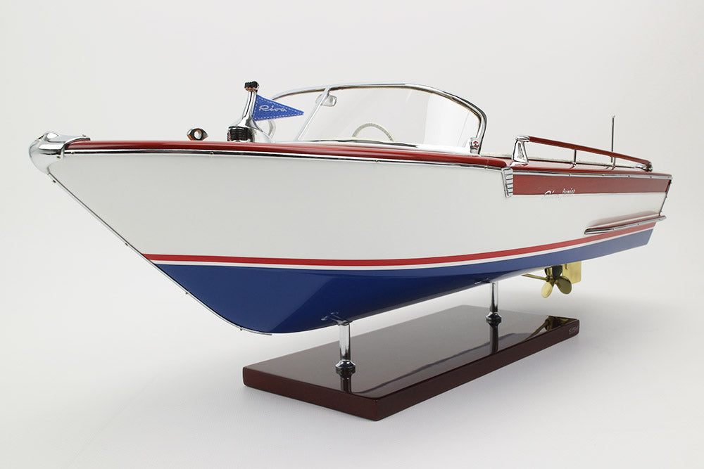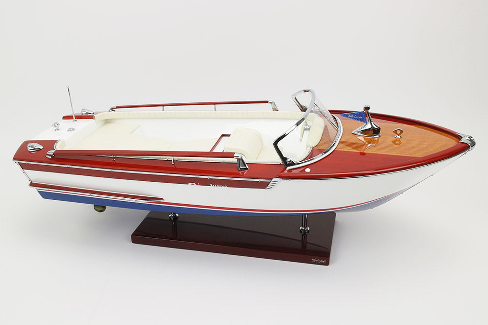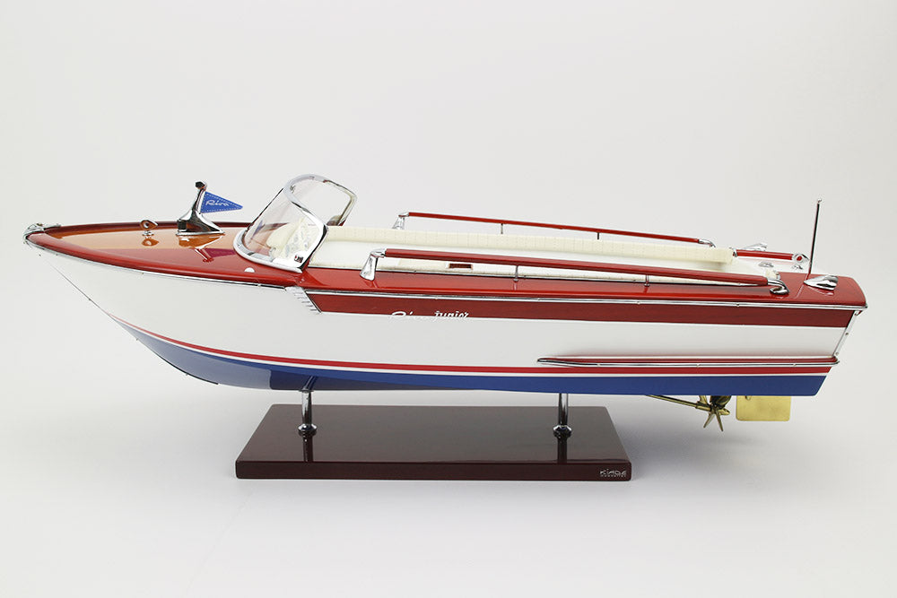 This model with a length of 70 cm was made at 1/20th scale. A faithful replica of the prestigious Rivarama, this exclusive official model is entirely handmade. The hull was made according to the original plans in fiberglass and polyester. All fittings are made to measure in chrome-plated brass by jewelers. Real marine upholstery is used to make the seats and the sun lounger. 10 coats of varnish are applied to the deck to achieve excellent shine and varnish depth. A metallic paint is applied to the hull.