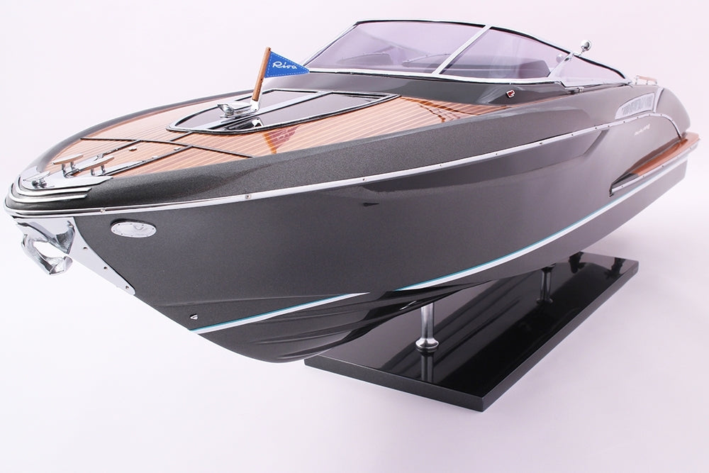 A faithful replica of the latest addition to the Riva range, this model is entirely handmade. The hull was made according to the original plans in fiberglass and polyester. All fittings are made to measure in chrome-plated brass by jewelers. Real marine upholstery is used to make the seats and the sun lounger. 10 coats of varnish are applied to the deck to achieve excellent shine and varnish depth. A metallic paint is applied to the hull.