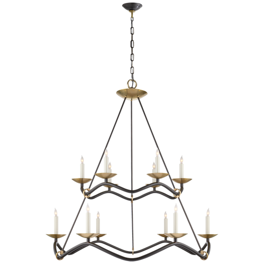 Piaf Grande Two-Tier Aged Iron and Ebonized Oak Chandelier with Linen Shades
