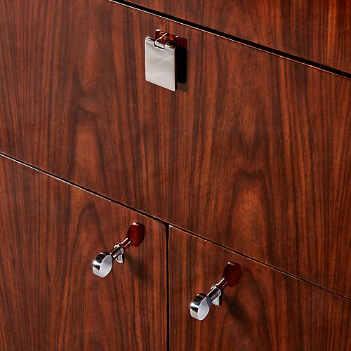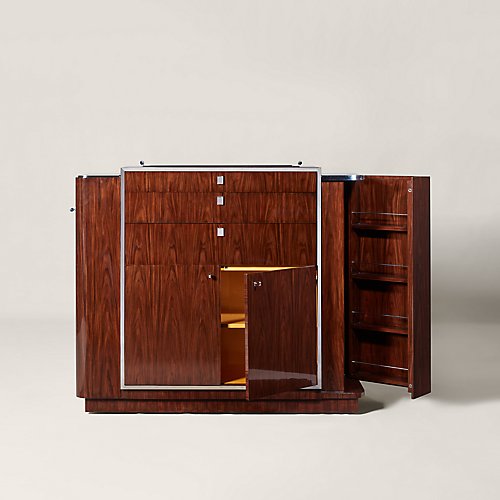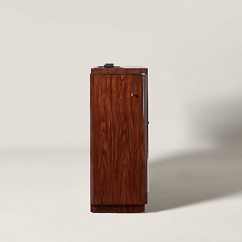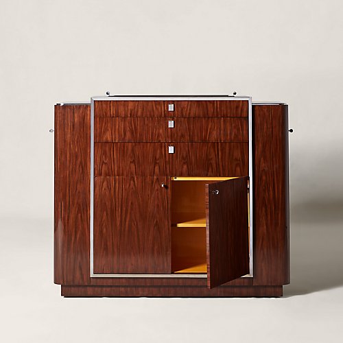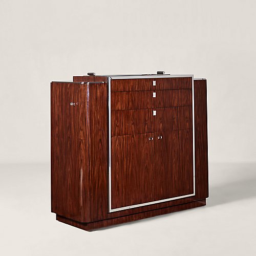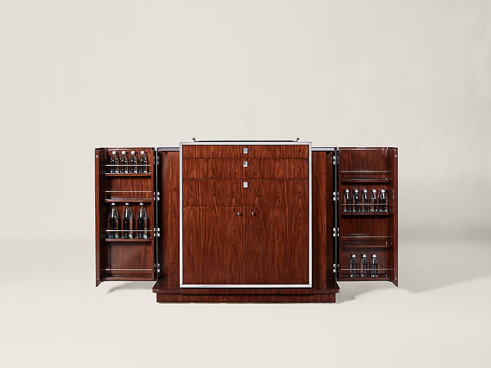 Expertly crafted from solid hardwood with our hand-finished rosewood finish, the Duke bar is accented with polished stainless steel. It sports a removable top, three slim drawers, a folding front and side doors housing shelves.