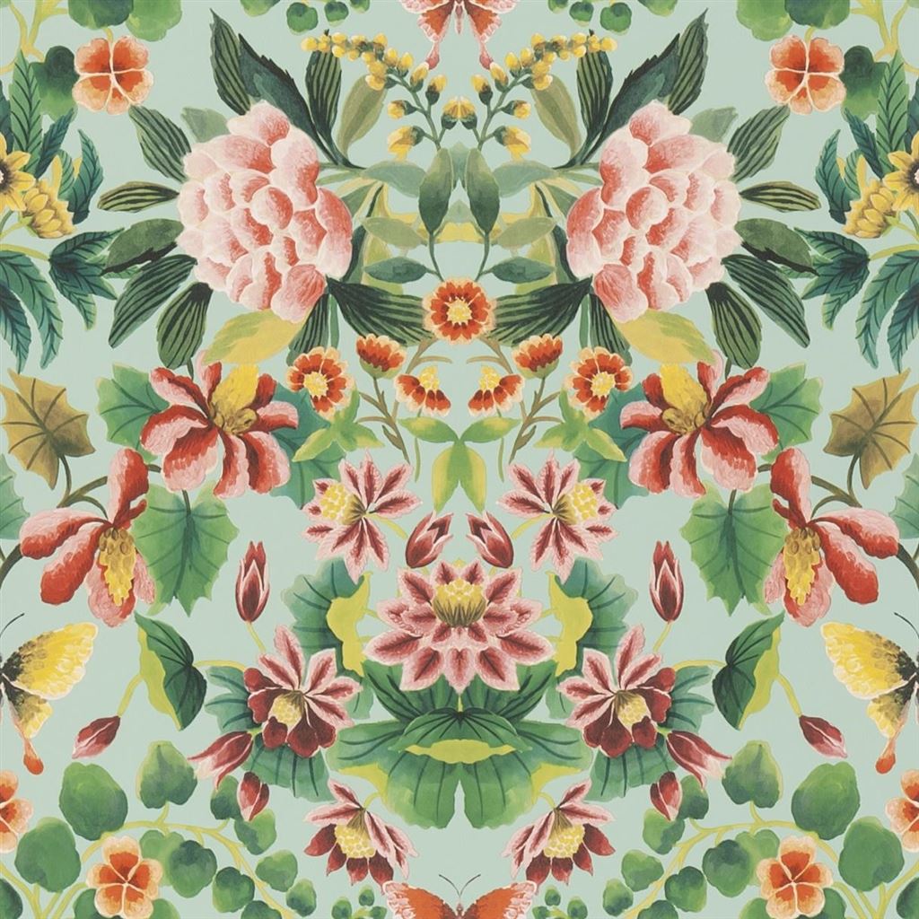 Exquisitely painted flowers, foliage and butterflies are arranged in a mirrored kaleidoscopic form to create a contemporary floral damask wallpaper. Printed in rotogravure on a non-woven backing for easy installation. Available in six stylish colors. Coordinating fabric and wallpaper panel also available. (Wallpaper - Width: 52cm, Vertical Trim: 52cm, 112.00 per roll)