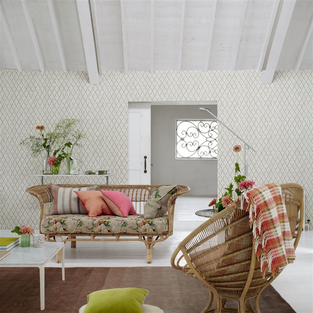 A subtly painted decorative trellis echoes the details of fine porcelain in this elegant wallpaper pattern. The ornate shapes are paired with a soft texture in the background and are screen printed on smooth non-woven paper for easy installation. Available in four stylish colourways and a complementary printed fabric also available. (Wallpaper - Width: 52cm, Vertical Trim: 52cm, 112.00 per roll)