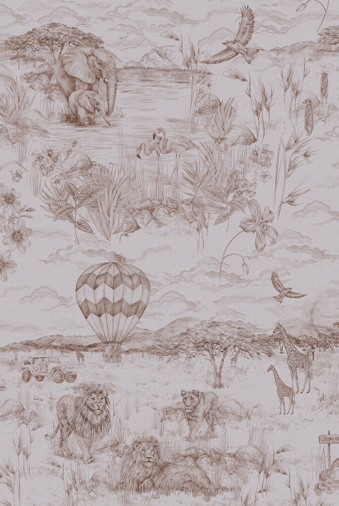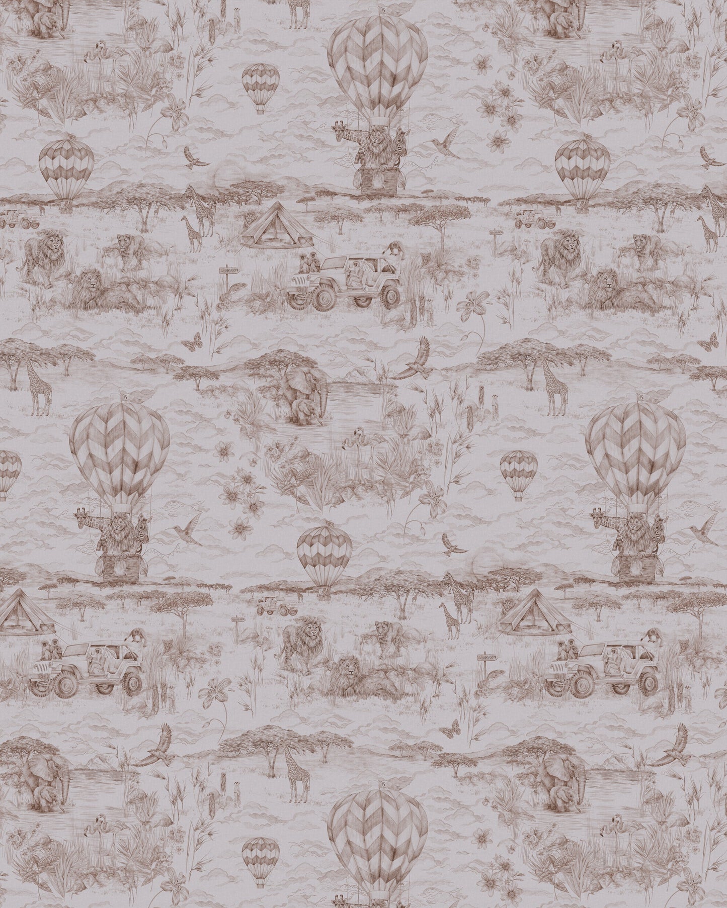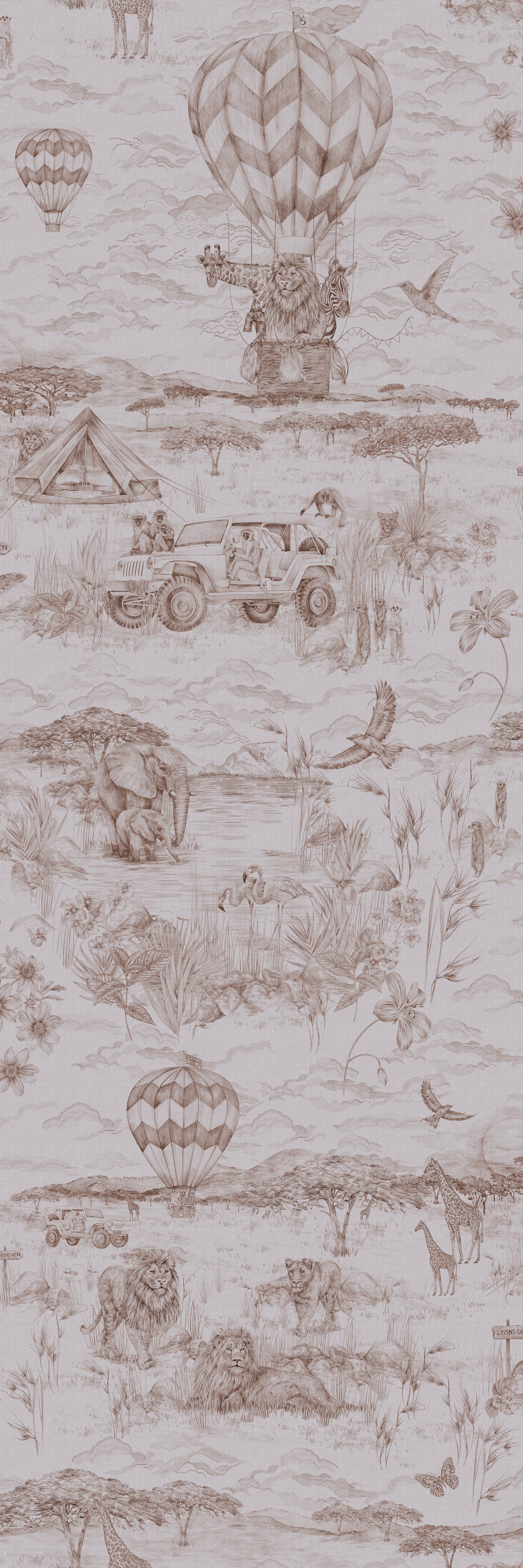 A friend looking for a design for her own child’s nursery inspired this project. I started designing while she was pregnant and after many months of work the design was ready just in time for baby Maggie’s arrival. Her last name is Lyons so lions had to be the theme of the wallpaper. I am fascinated by Tanzania and the vast ecosystems of the Serengeti and Kitula National Parks. We decided that would be the setting for the design. Liking the idea of ​​incorporating hot air balloons into the wallpaper, an animal-led safari began to shape the story. I love the traditional French toile style, so delicate, chic and intricate; it seemed like the perfect way to lay it out and colour it. The design evolved from there with endless additions and tweaks, but the devil is really in the details for this one. Find all the little creatures hidden and read the tale woven into the wallpaper…