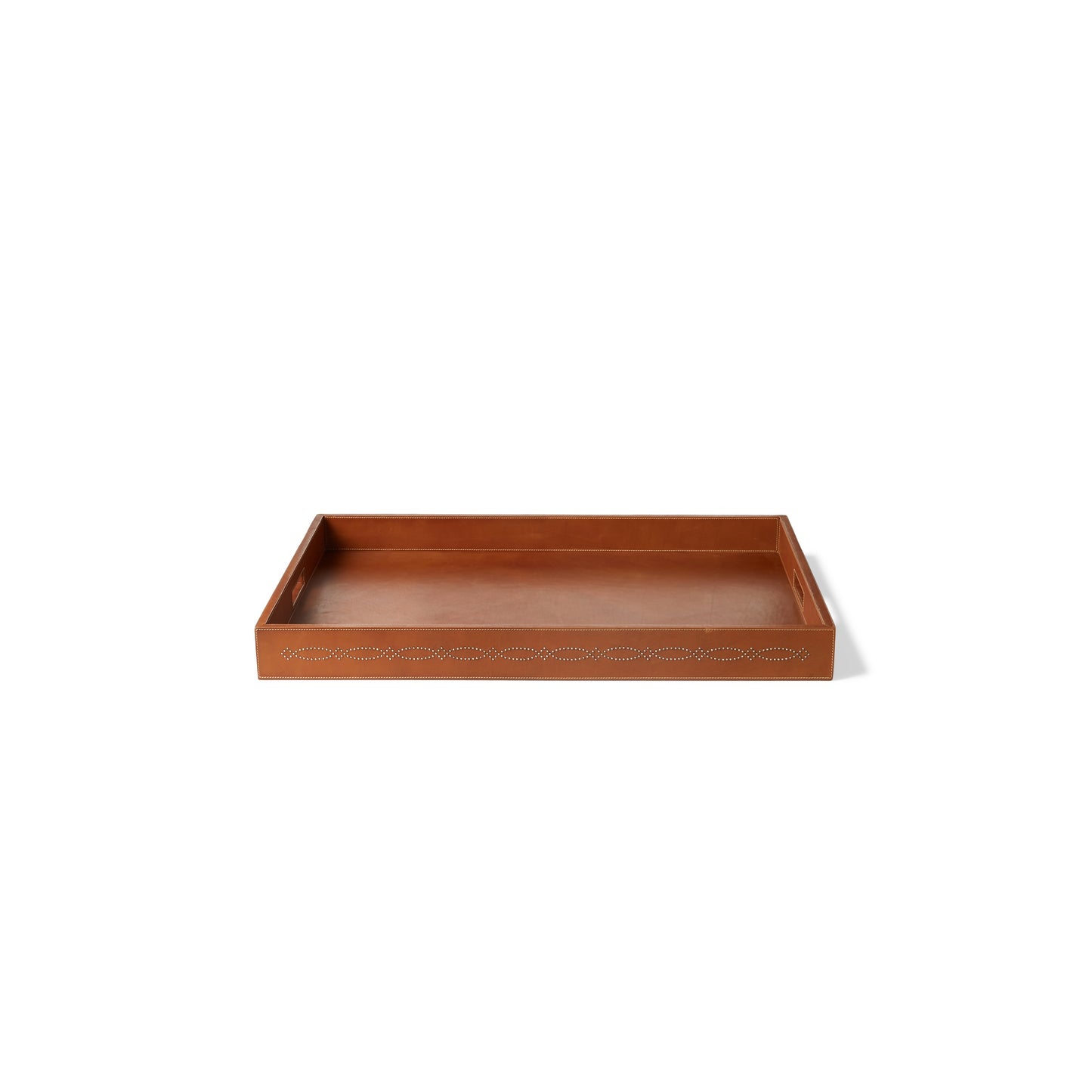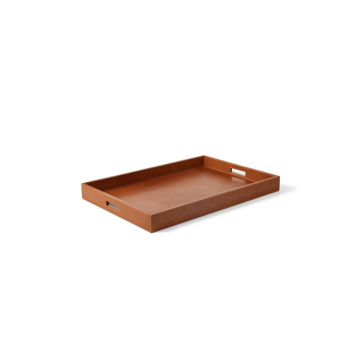 Inspired by a well-worn vintage leather cuff, the Bromley tray evokes the essence of the American frontier. The heroic proportions of this tray make it the perfect size for displaying many home accessories. There's plenty of room for coffee table books, a candle, a floral arrangement, or whatever else you want to display!