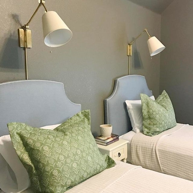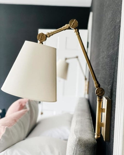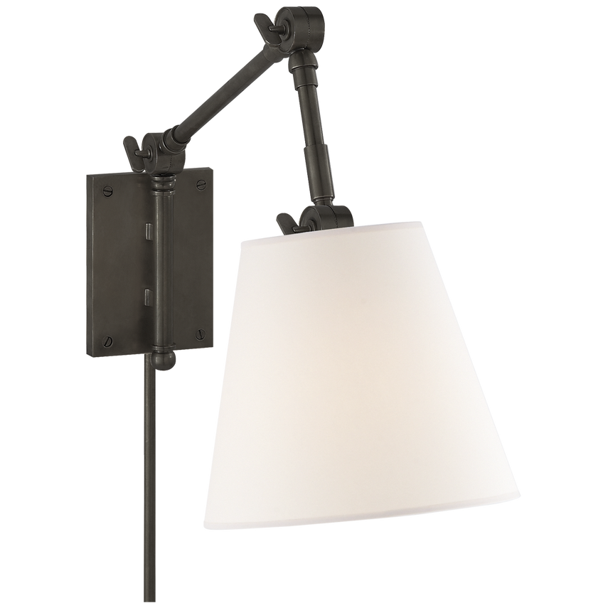 Suzanne Kasler's Graves is both refined and functional. The articulated arms in bronze, nickel, or antique brass create a vintage, industrial feel. The swivel heads topped with a linen shade focus light where it's needed most in home offices, libraries, or any favorite reading space.