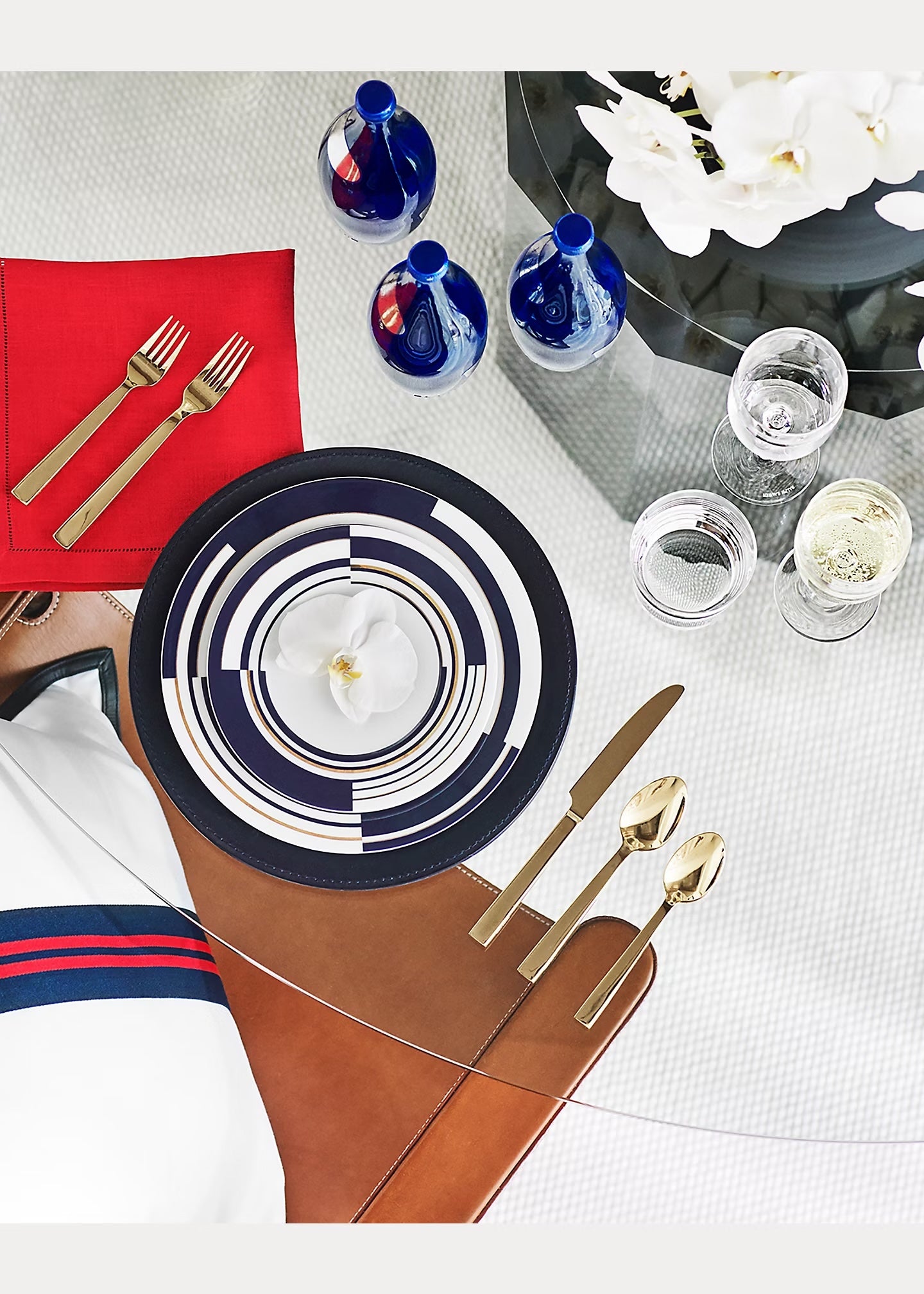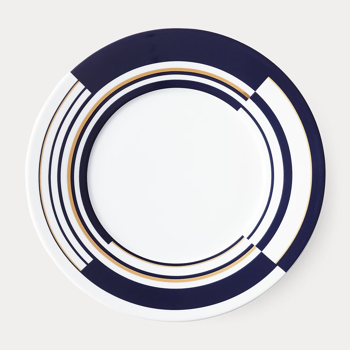 S'inspirant d'un foulard vintage illustrant un souvenir de course automobile, cette assiette à salade en porcelaine arbore un motif graphique dans une couleur classique et des finitions en or 24 carats.