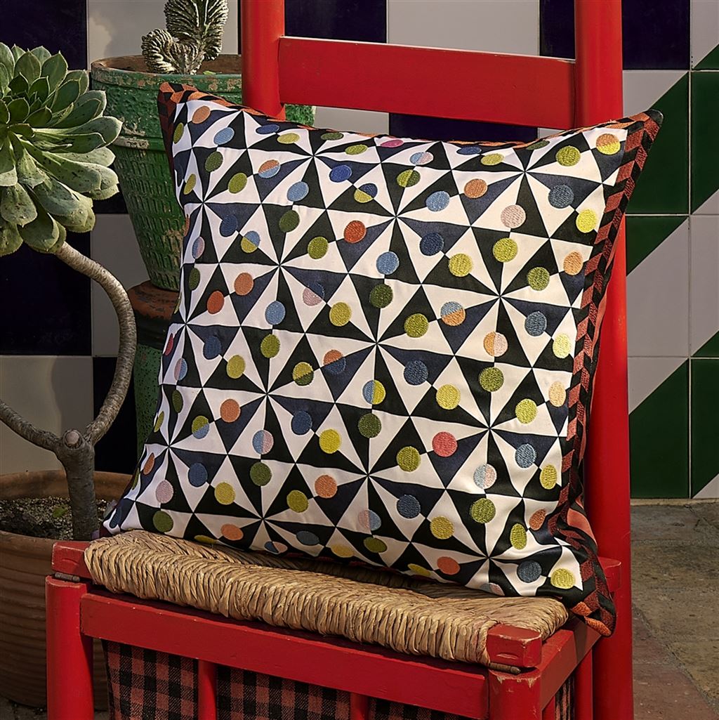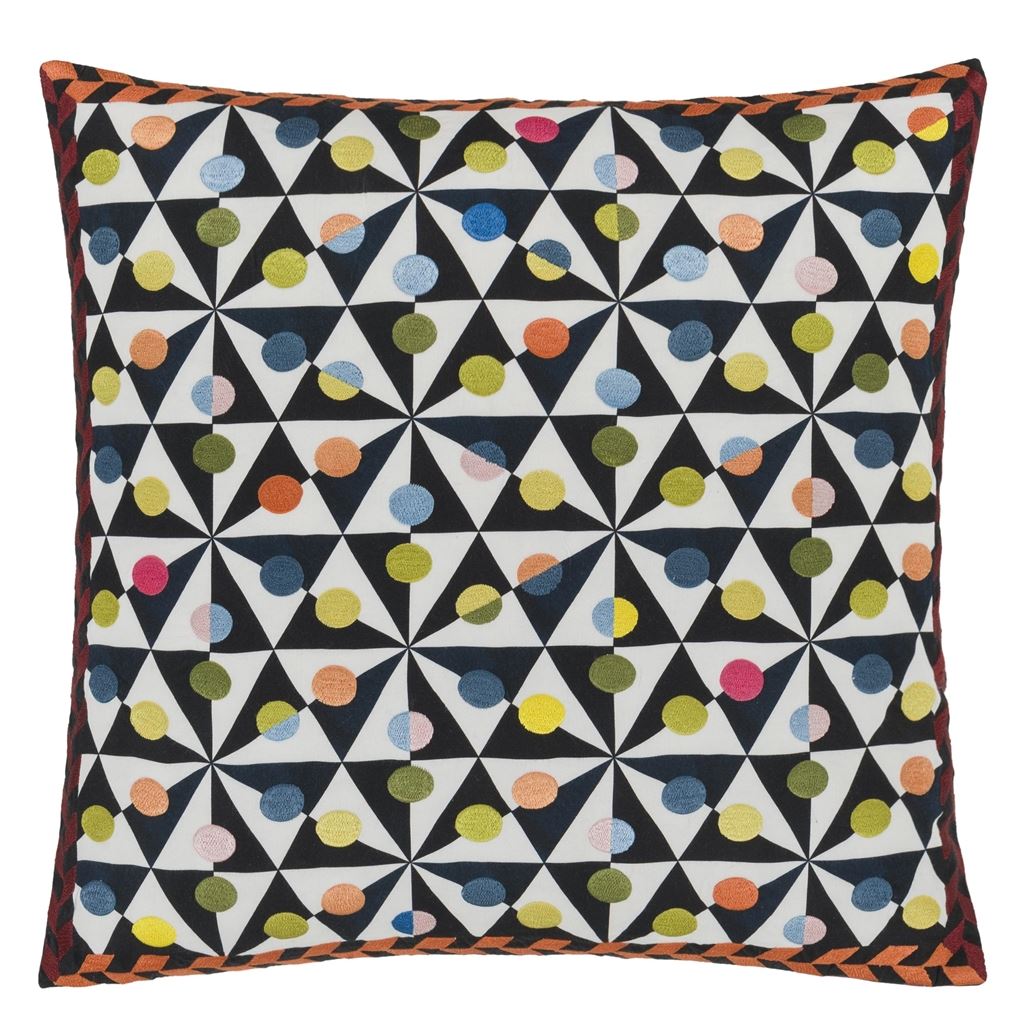 A graphic pattern, digitally printed onto cotton sateen, is highlighted with multi coloured embroidered polka dots in this stunning cushion by Christian Lacroix Maison. Reversing to a graphic pattern on luxurious sateen.