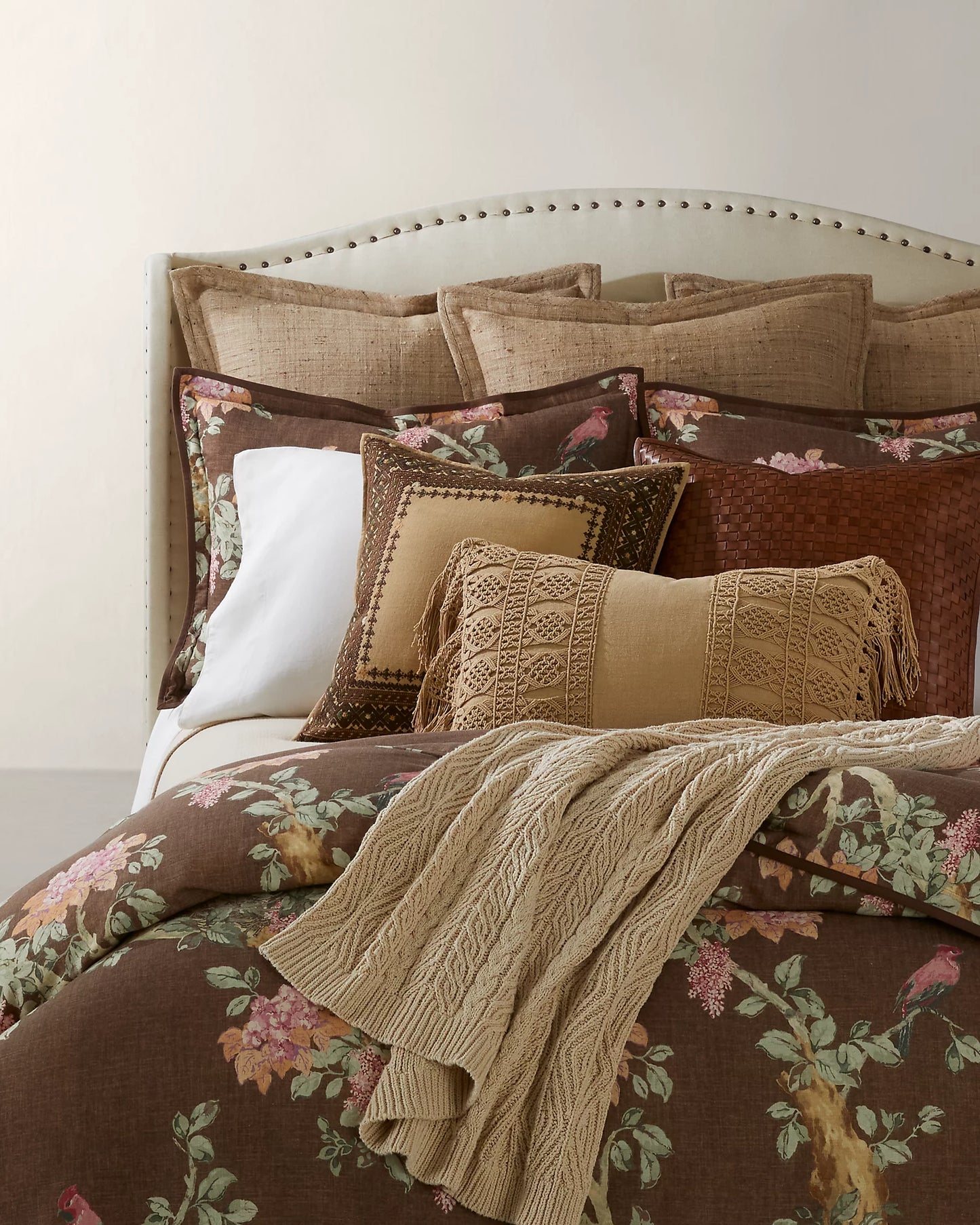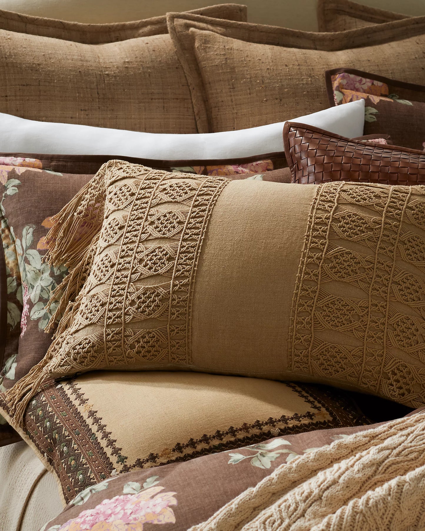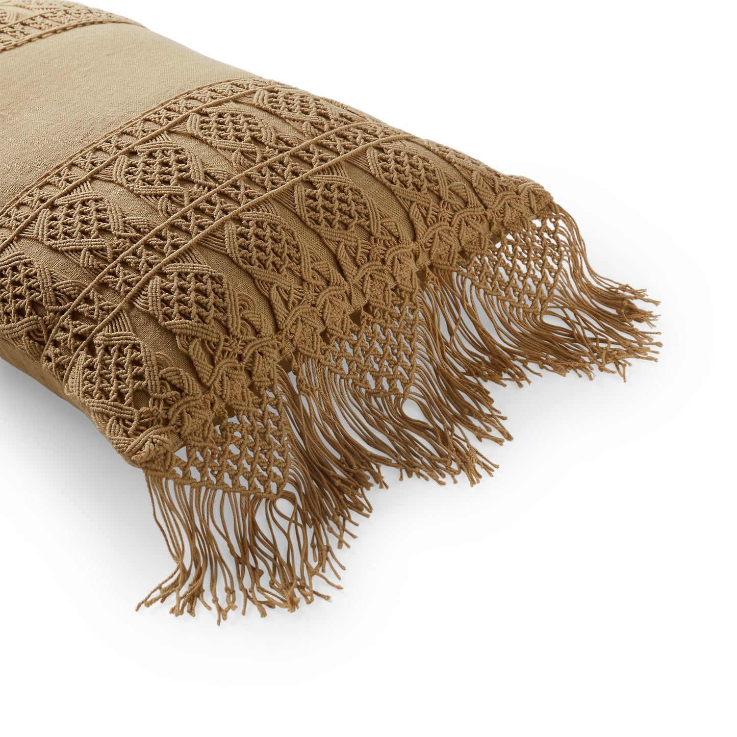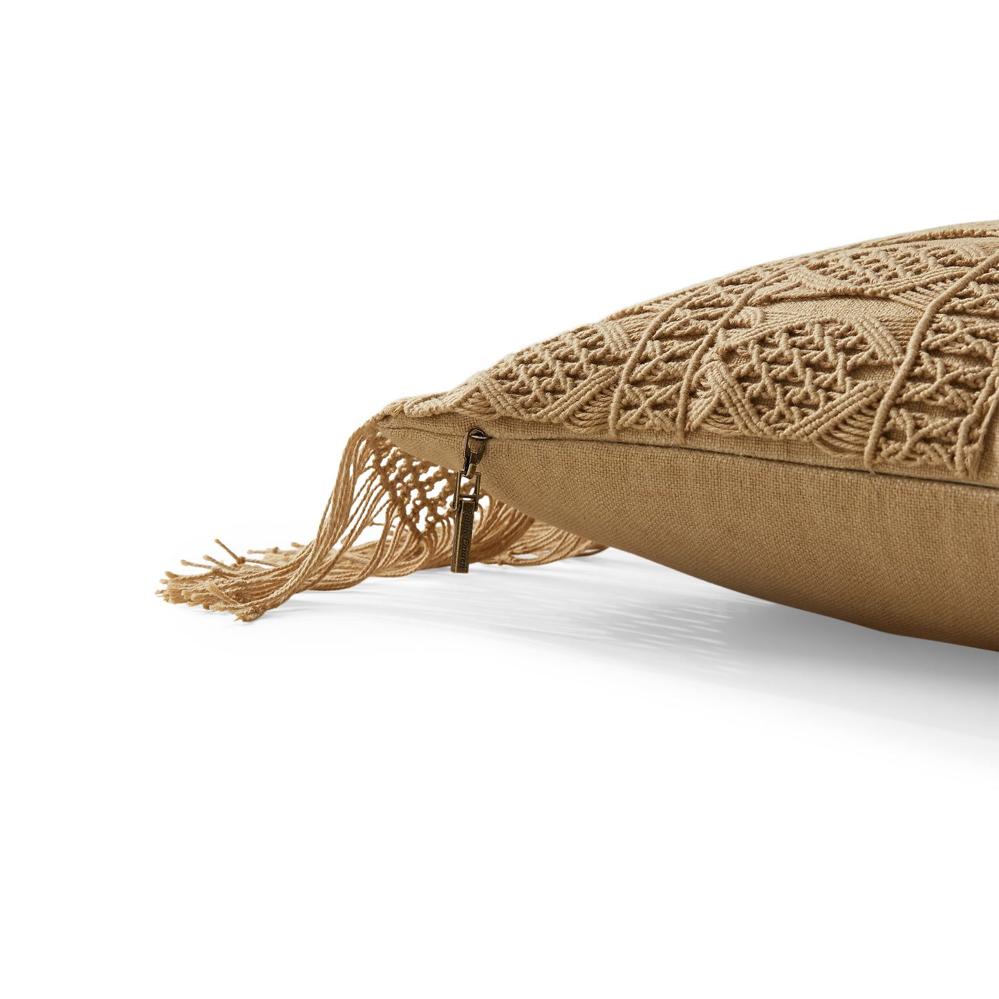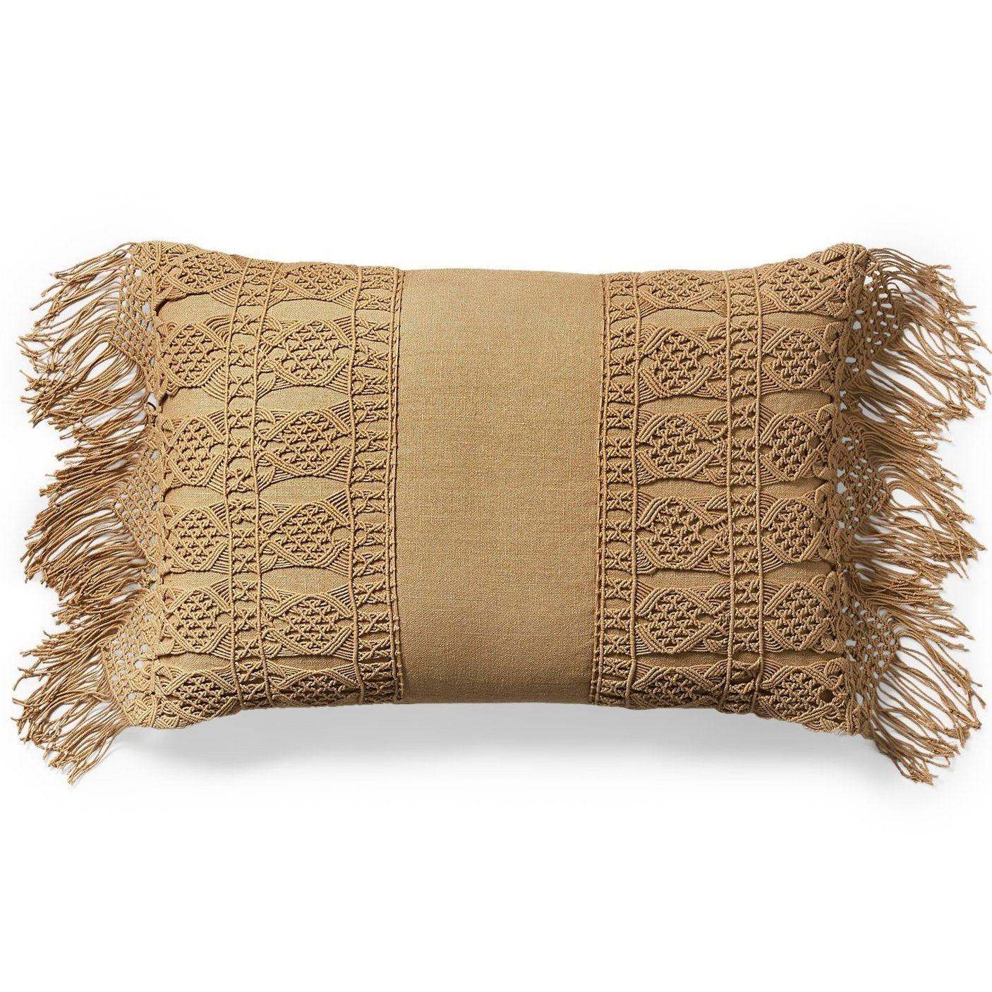 Tissé en lin pur, le coussin Lindsey est rehaussé d’un macramé élaboré devant qui se transforme magnifiquement en une délicate frange en corde.