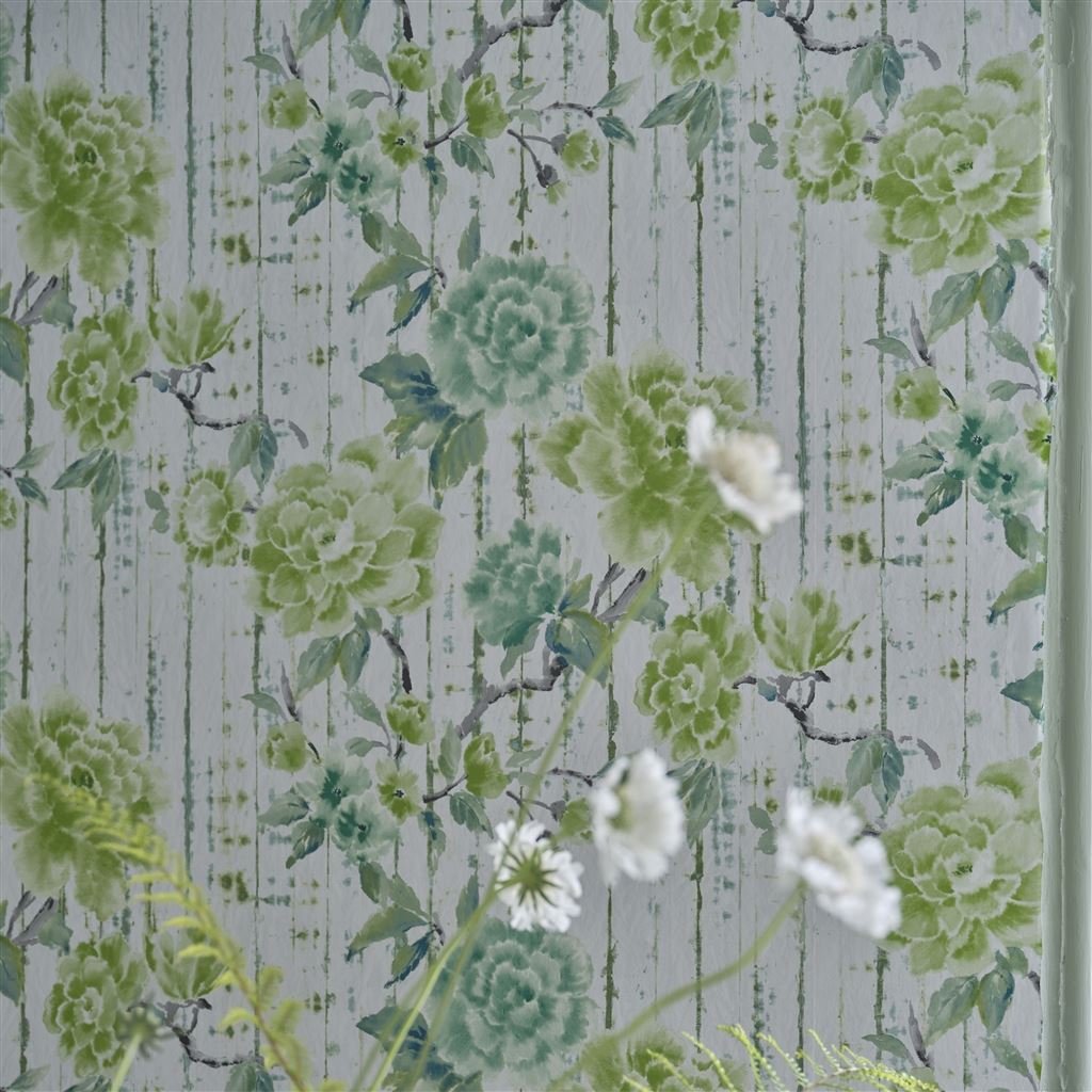Ce papier peint floral sophistiqué présente des pivoines et des roses sur un fond rayé de couleur eau, inspiré par la saison des fleurs du printemps à Kyoto. Imprimé en héliogravure sur un support intissé. Disponible en cinq coloris. Tissu coordonné également disponible. (Wallpaper - Largeur: 52cm, Raccord Vertical: 52cm, 112.00 par rouleau)