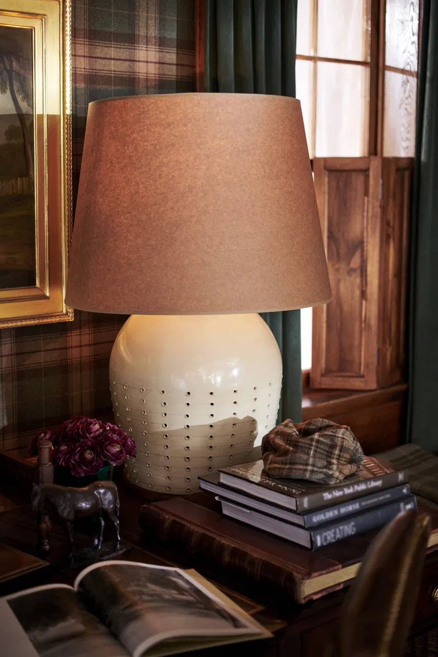 Arborant de délicates perforations sur l'ensemble de sa structure incurvée en porcelaine, la lampe à poser Halifax confère un style décontracté à un salon, une entrée ou une chambre. La silhouette arrondie est rehaussée d'un abat-jour en papier aérien pour une touche joliment détendue.