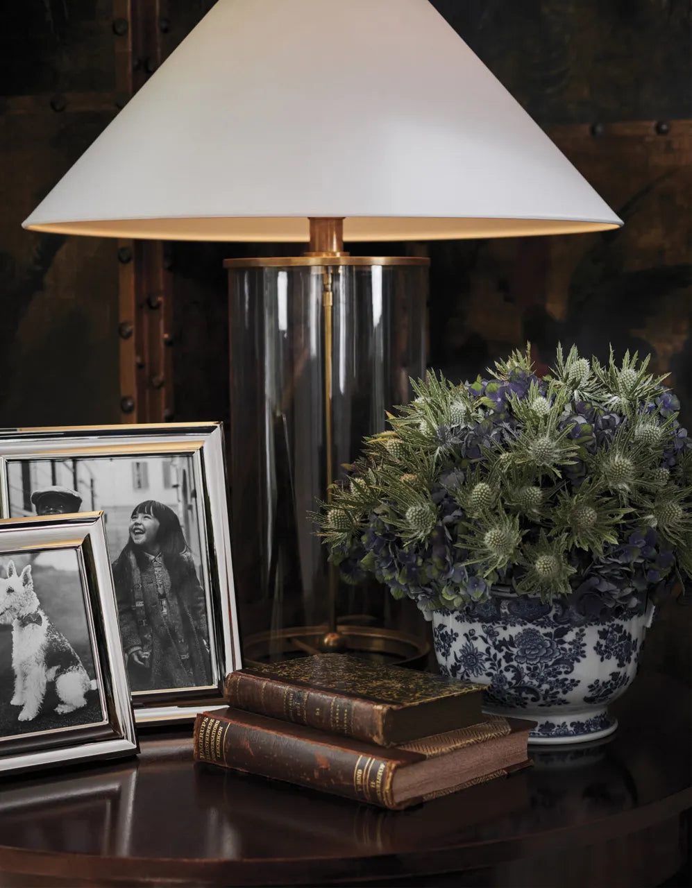 La structure cylindrique de la lampe à poser Modern signée Ralph Lauren est associée à un abat-jour fuselé en papier diffusant une lumière lumineuse vers le bas. Une bordure en laiton massif rehausse cette pièce contemporaine et lui confère une touche polie.