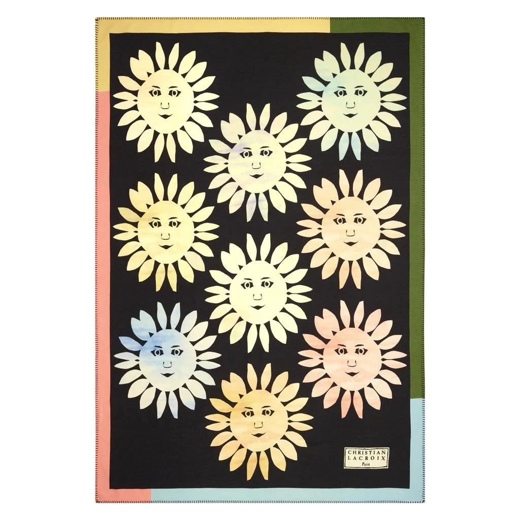 Des formes géométriques riches et audacieuses sont astucieusement assemblées dans des tons magenta et rouge profonds. Contrastant avec le noir dans le fond, ce plaid d'intérieur de Christian Lacroix est imprimé numériquement sur de la pure laine mérinos luxueuse et fini avec un bord en point de feston noir sur les quatre côtés.