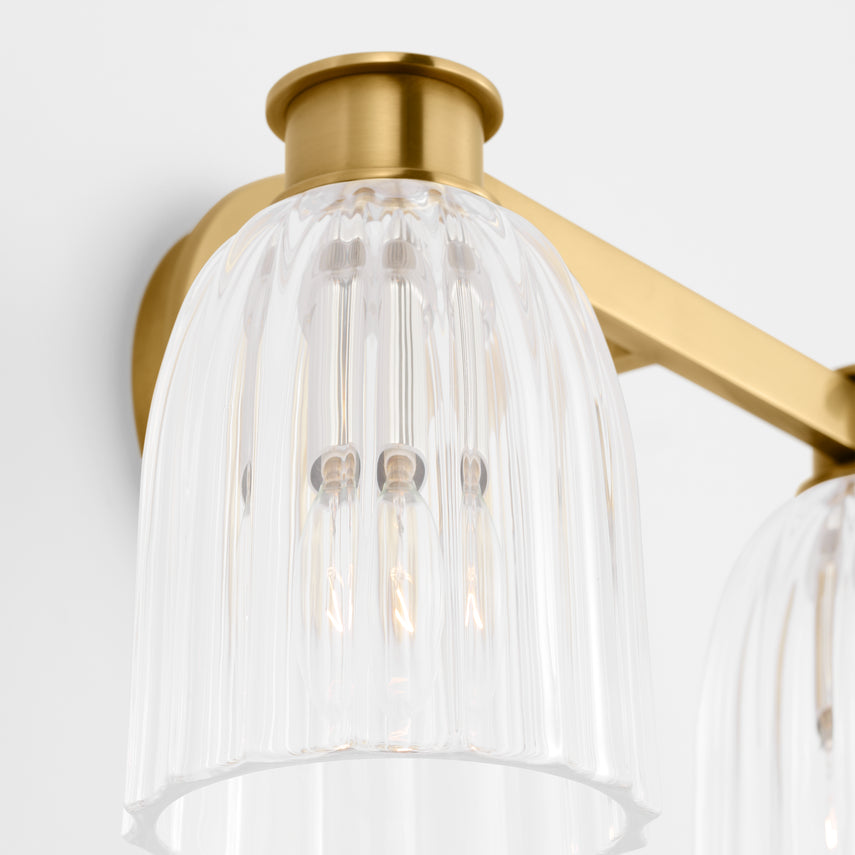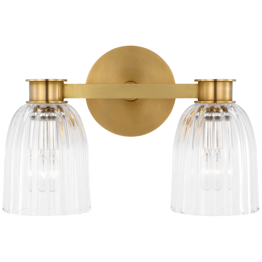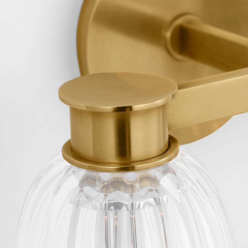 Interprétation contemporaine du design français du milieu du siècle, cette applique est fabriquée à partir de deux lumières en verre en forme de coupe avec une finition nervurée et est fixée à une plaque murale circulaire.