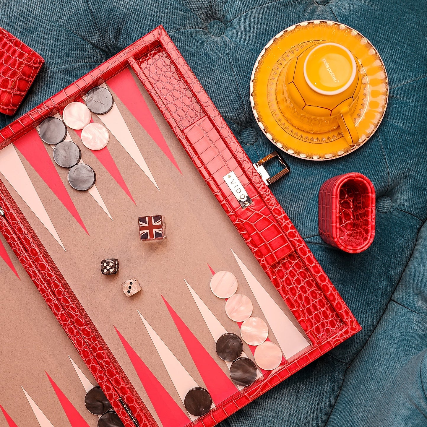 Notre backgammon Framboise embossé Alligator est fabriqué avec soin en cuir vegan, avec pions et dés nacrés, et notre dé doubleur VIDO signature.