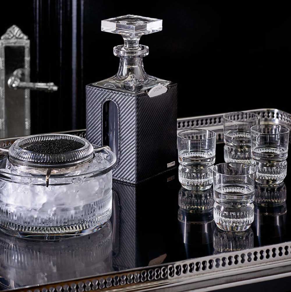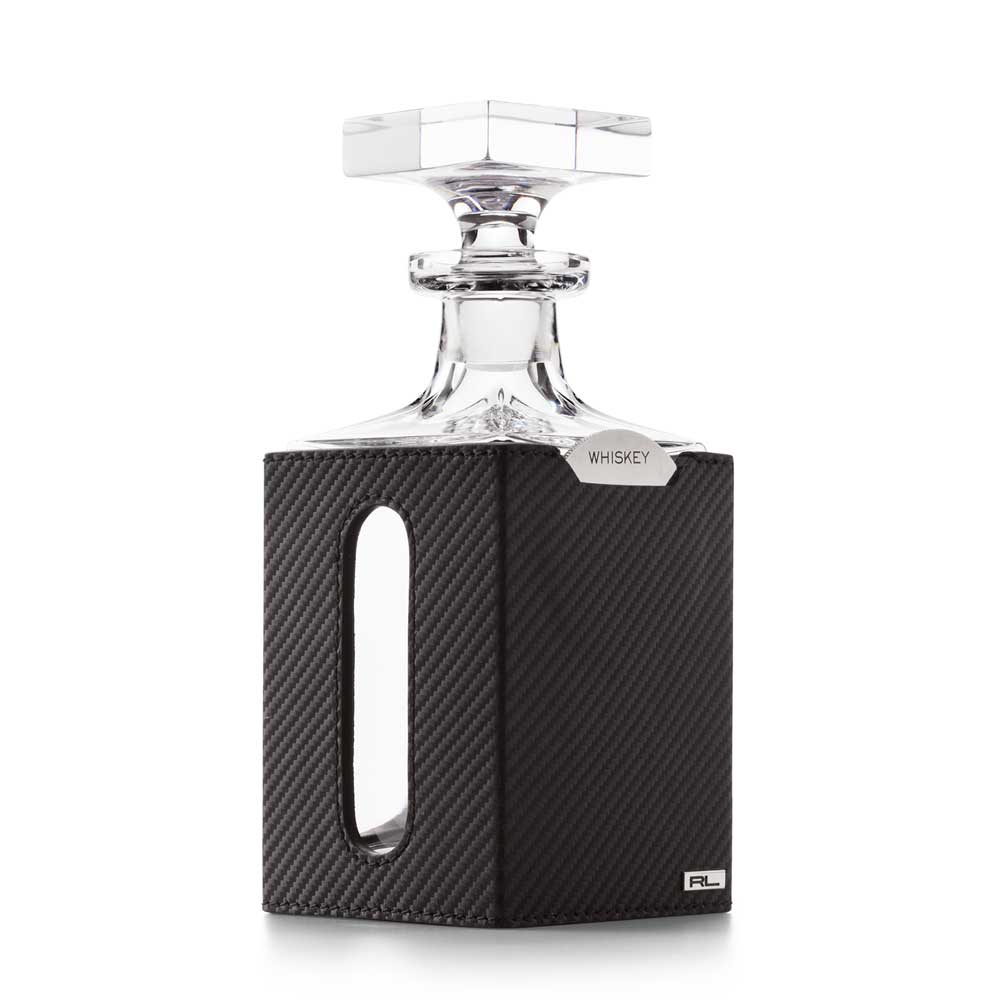 Cette carafe / décanteur Ralph Lauren, en cristal, arbore une plaque rotative en nickel gravée "Whiskey", "Gin", "Rum", "Scotch" et "Vodka" pour indiquer l'alcool qu'elle contient. Son étui en cuir gaufré à motif fibre de carbone est également amovible pour un nettoyage facile. Une ouverture dans le cuir sur le coté permet de voir le niveau de remplissage.