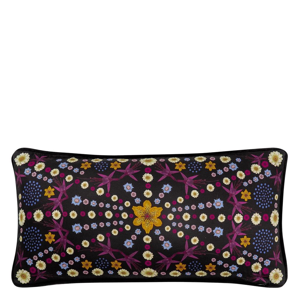 Ce coussin brodé Christian Lacroix présente une multitude de fleurs colorées qui tombent en cascade sur un fond en lin noir. Ce motif graphique est imprimé numériquement sur un satin de coton, il se compléte par un passepoil en velours noir.
