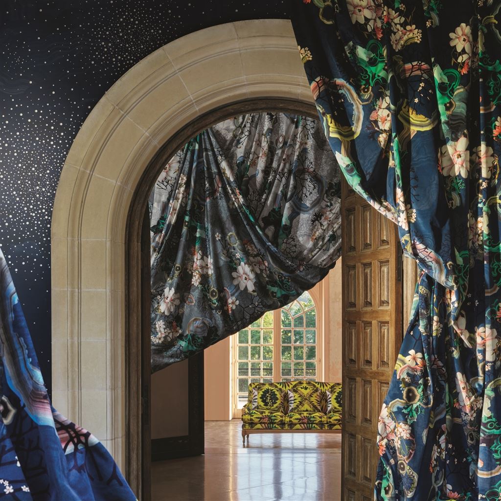 Laissez-vous emporter par votre imagination dans un jardin à la française où les plantes sont à la fois des plumes et des feuilles et où vous ne pouvez pas vraiment dire où l'une finit et l'autre commence. Dans cet imprimé graphique de Christian Lacroix, des formes de feuilles et de palmiers à l'effet de plumes sont superposées à de douces et délicates nuances de couleurs et d'ombres. Imprimé numériquement sur un luxueux velours de coton, il convient aux rideaux, stores, coussins et tissus d'ameublement. (Fabric - Largeur: 133cm, Raccord Horizontal: 133cm, Raccord Vertical: 68cm302.00 par mètre)