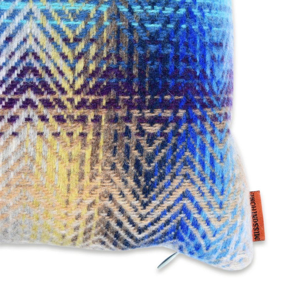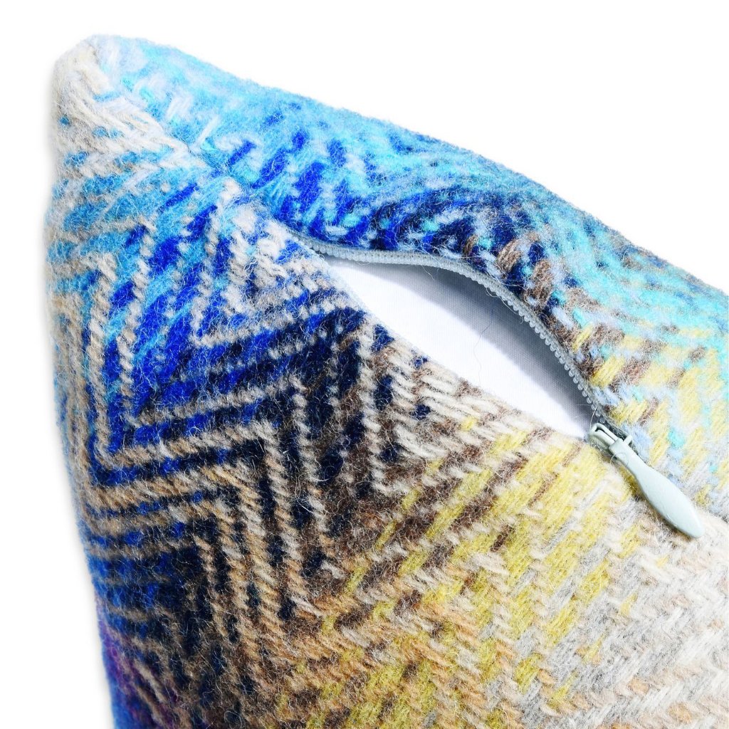 - Coussin en laine, chaud et coloré, motifs géométriques nuancés.
