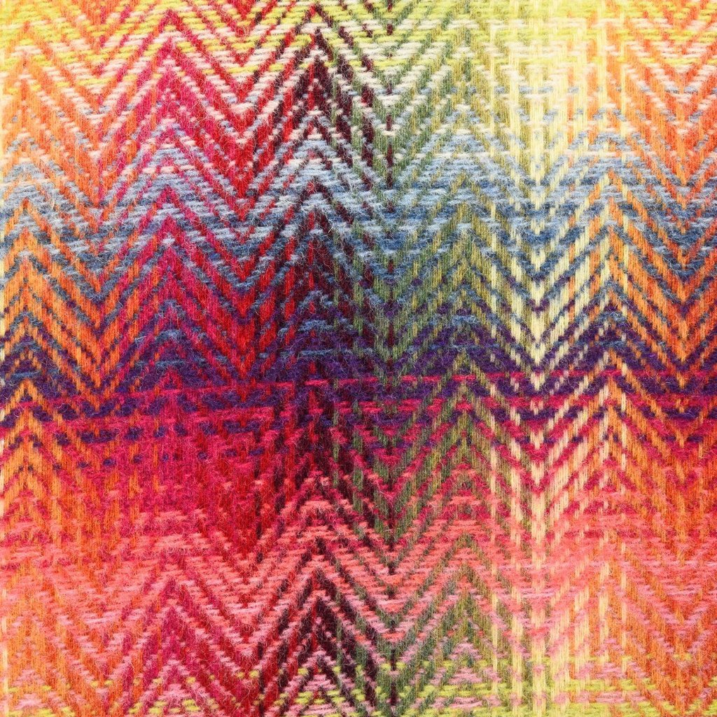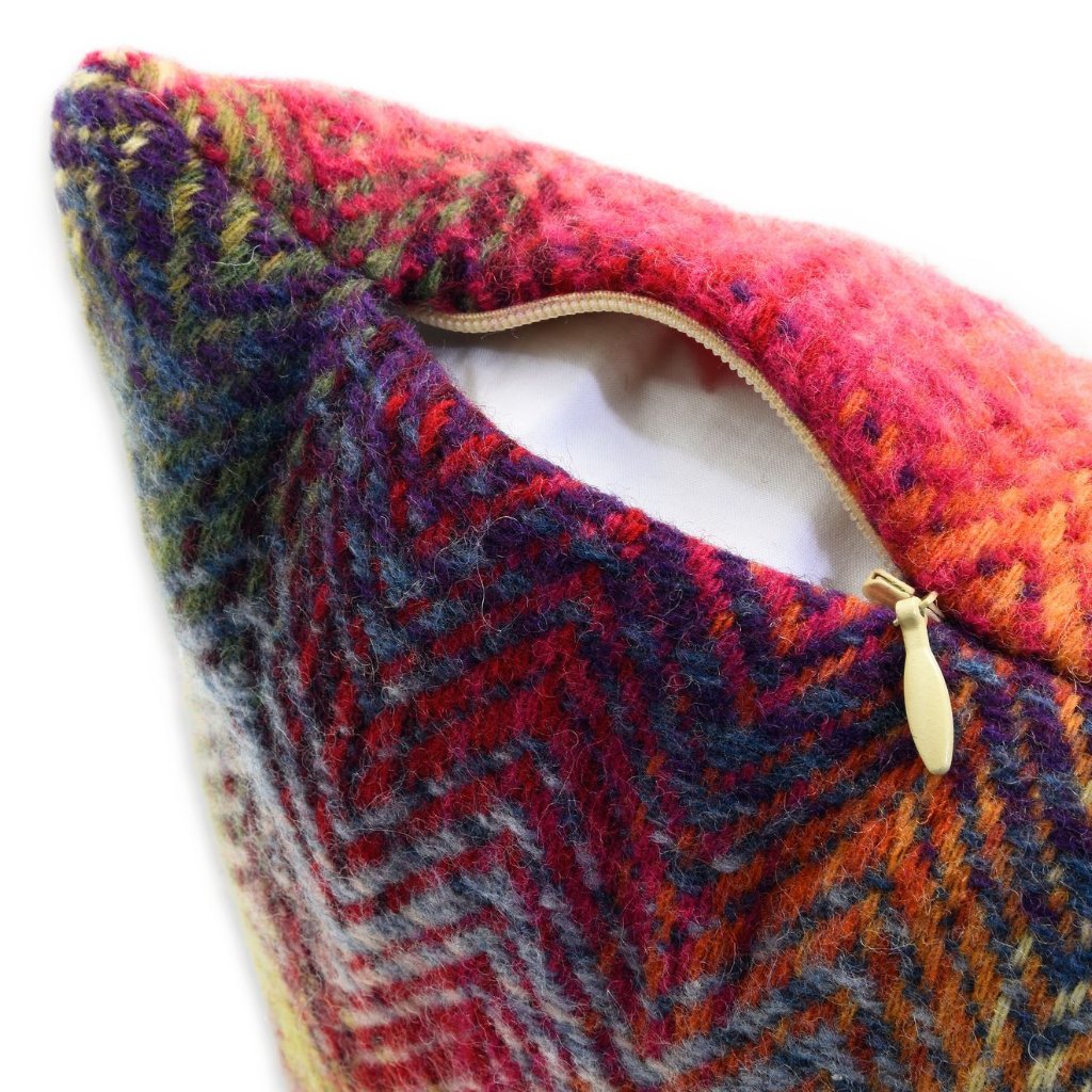 - Coussin en laine, chaud et coloré, motifs géométriques nuancés.