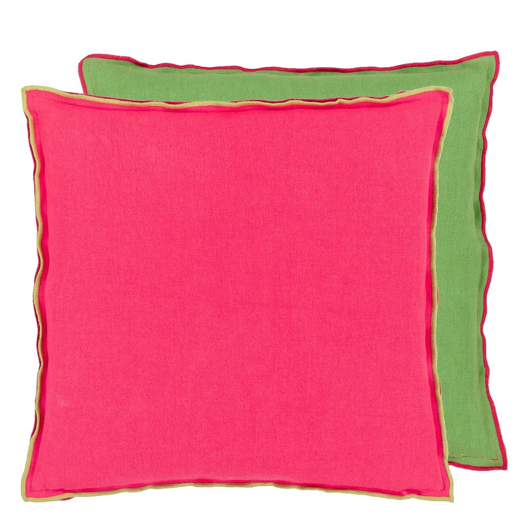 Ce coussin carré contemporain en rose cerise, qui se transforme en vert gazon, est réalisé en deux tons de pur lin chiné Brera Lino. Fini avec une bordure tonale en points surjetés, ce coussin moderne en lin est le complément parfait de tout arrangement.