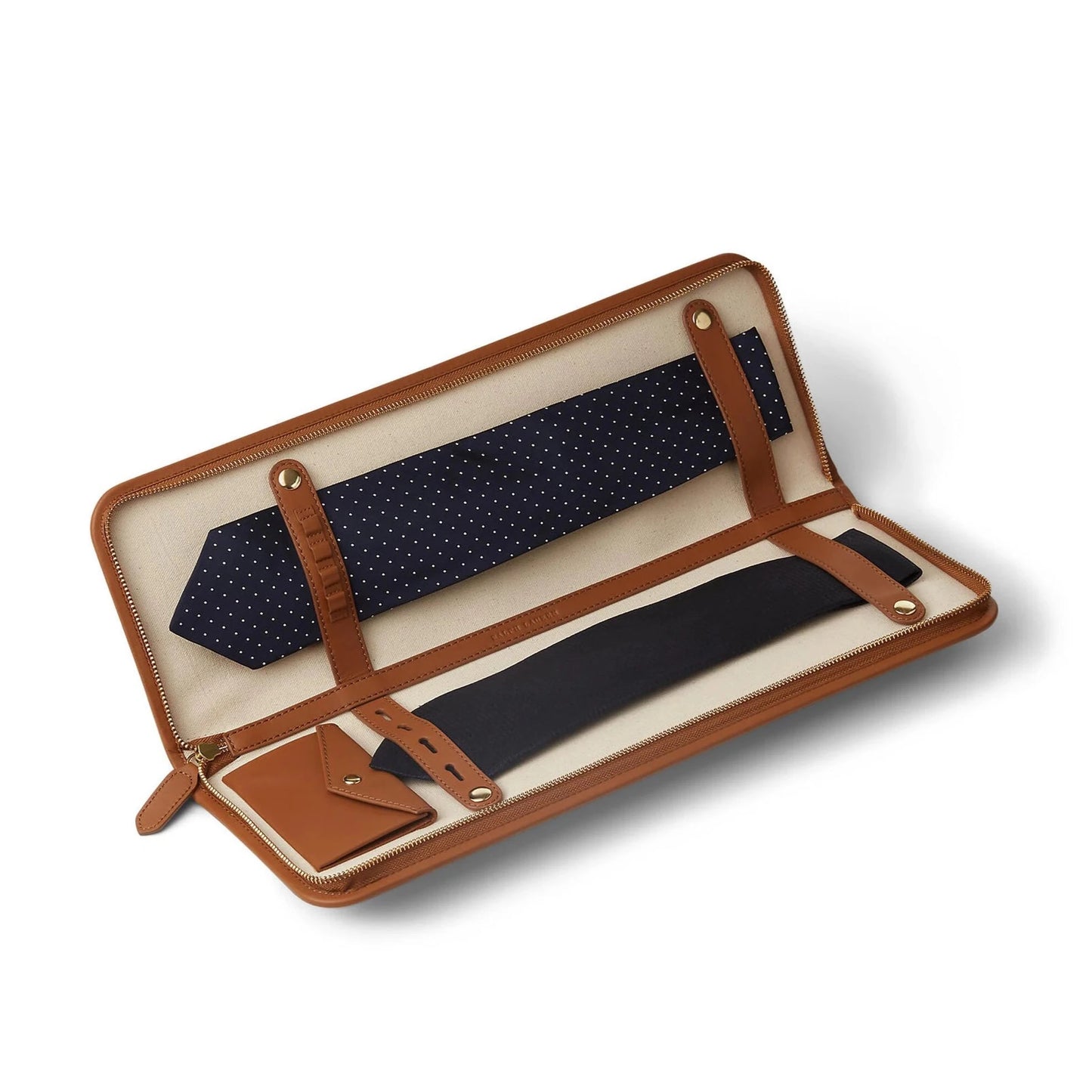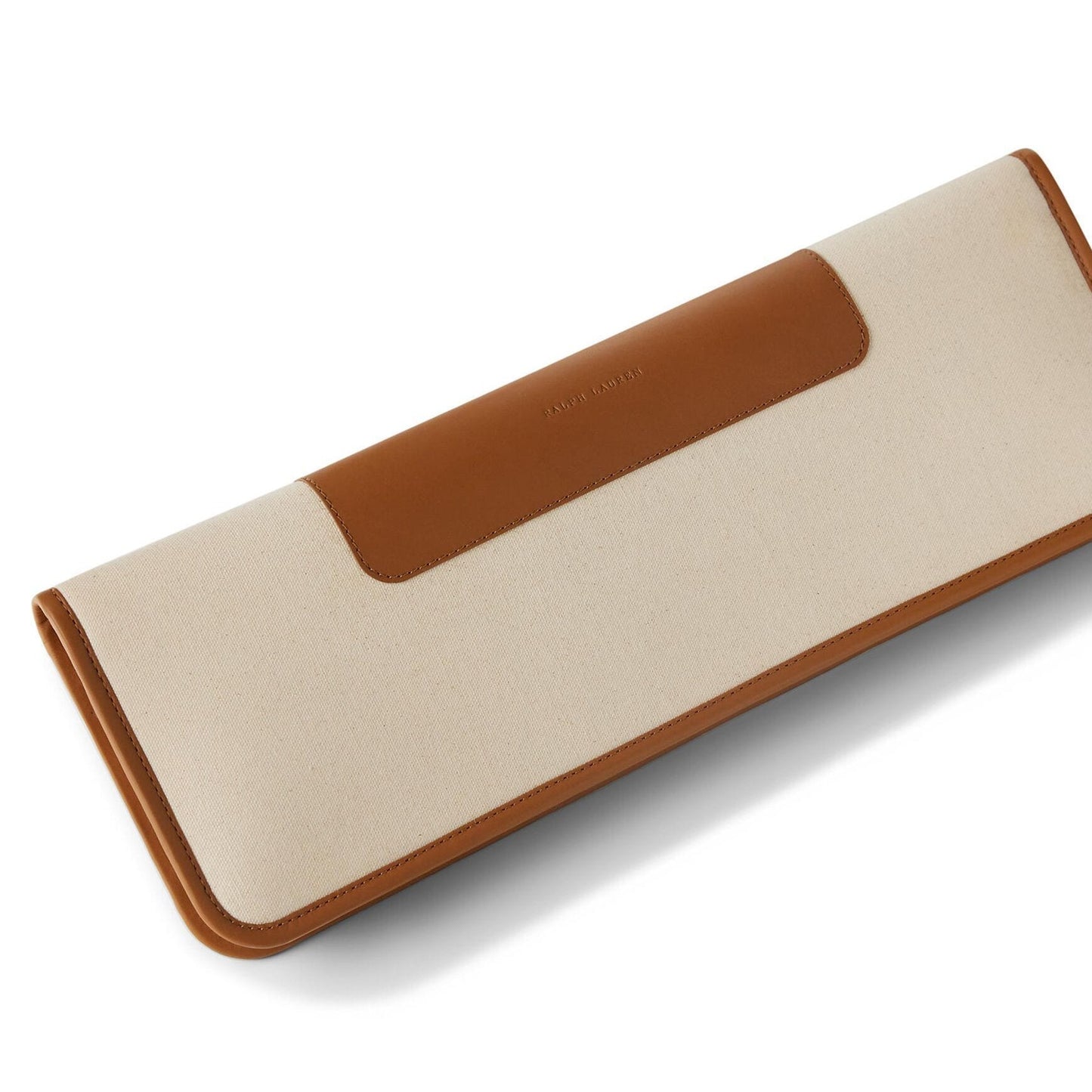 Issu de la collection Garrett d'inspiration équestre signée Ralph Lauren, cet étui à cravate associe du cuir de selle à de la toile résistante et des ornements en laiton. Outre l'espace dédié aux cravates, cet accessoire de voyage indispensable est conçu pour ranger les boutons de manchette et les baleines de col, tandis qu'une pochette intérieure peut accueillir les accessoires supplémentaires.